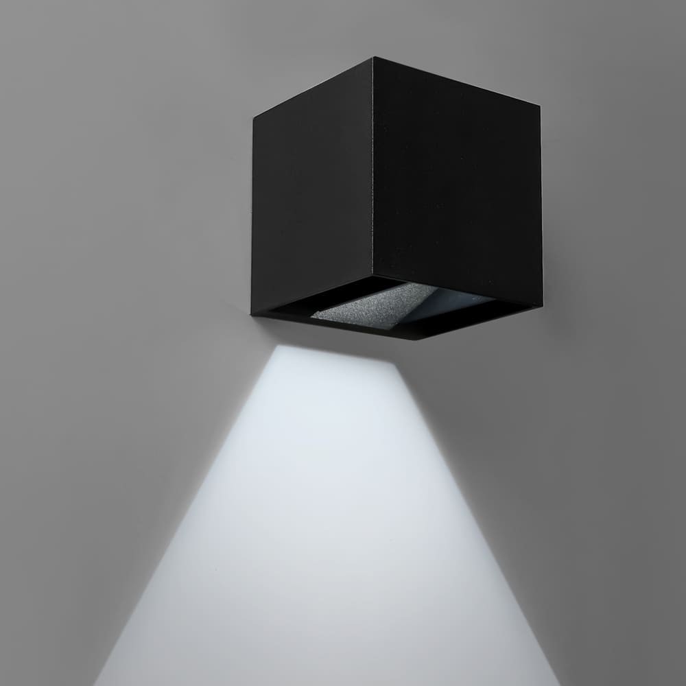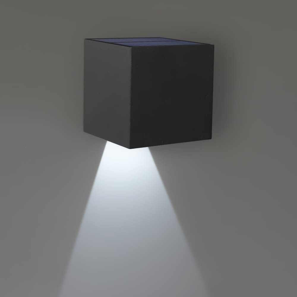 Aplique de pared LED Open con panel solar. Este aplique de forma de cubo es muy práctico para iluminar zonas de paso en jardines, porches y terrazas. Puedes ajustar el ángulo de apertura de la luz (0º-120º) y cuenta con un sensor de movimiento con dos configuraciones. La batería del aplique se carga con la luz del sol gracias al panel solar situado en la parte superior. Fabricado en aluminio color gris antracita.