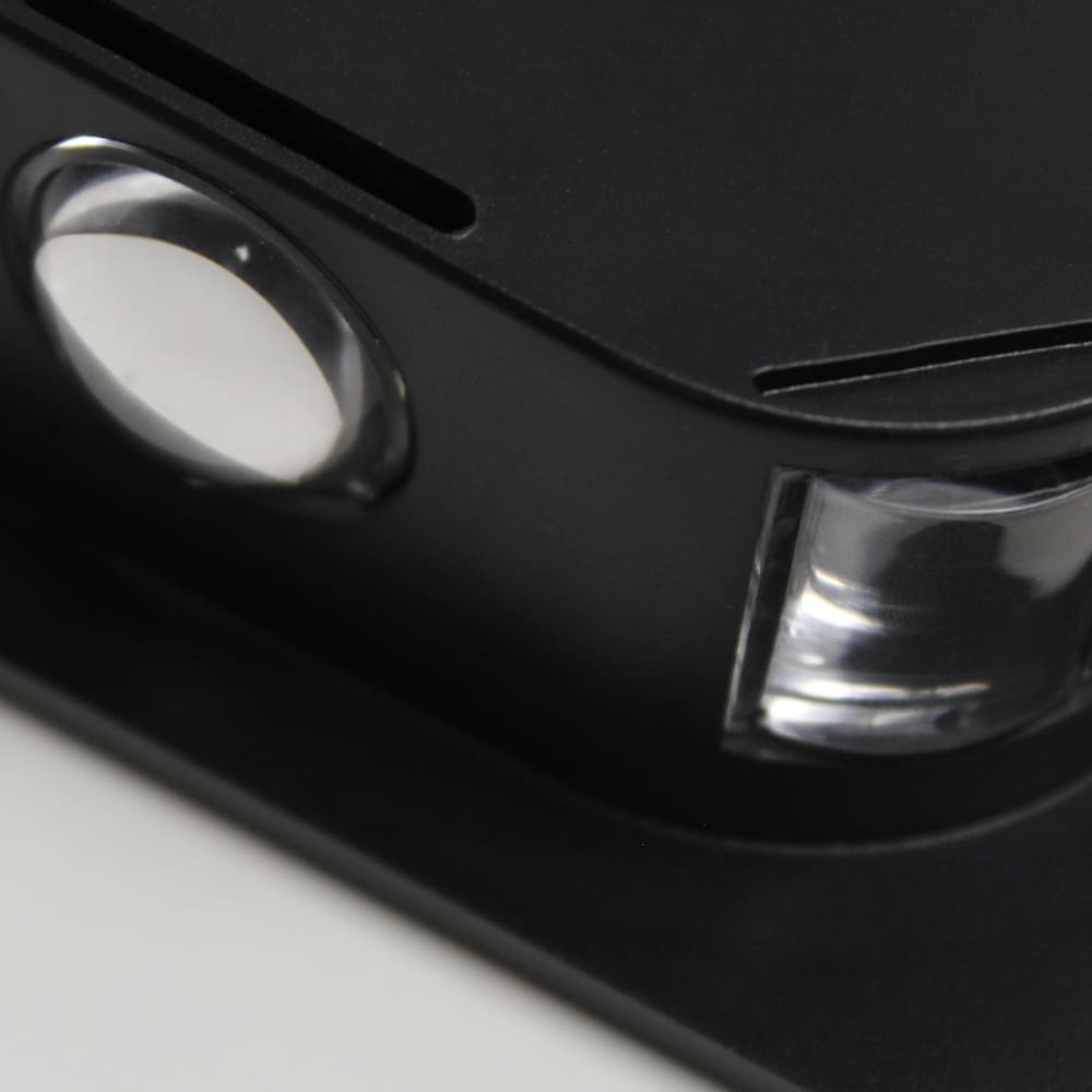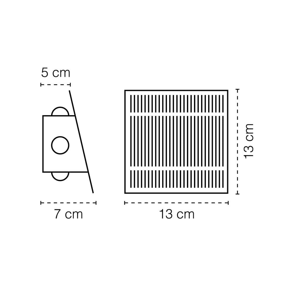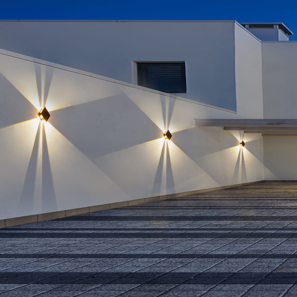Aplique de pared LED Calm para iluminación exterior. El aplique cuenta con seis puntos de luz de modo que tres se proyectan en una dirección y tres en otra iluminando la pared. Lleva integrado un sensor de movimiento para configurar el aplique de modo que se encienda al detectar presencia en el entorno. Panel solar en la parte frontal del aplique para cargarlo durante el día con la luz del sol. Iluminación LED con dos temperaturas de color seleccionables (3000K o 6000K).
