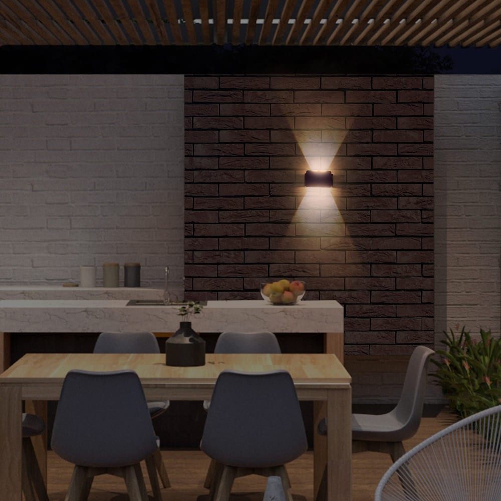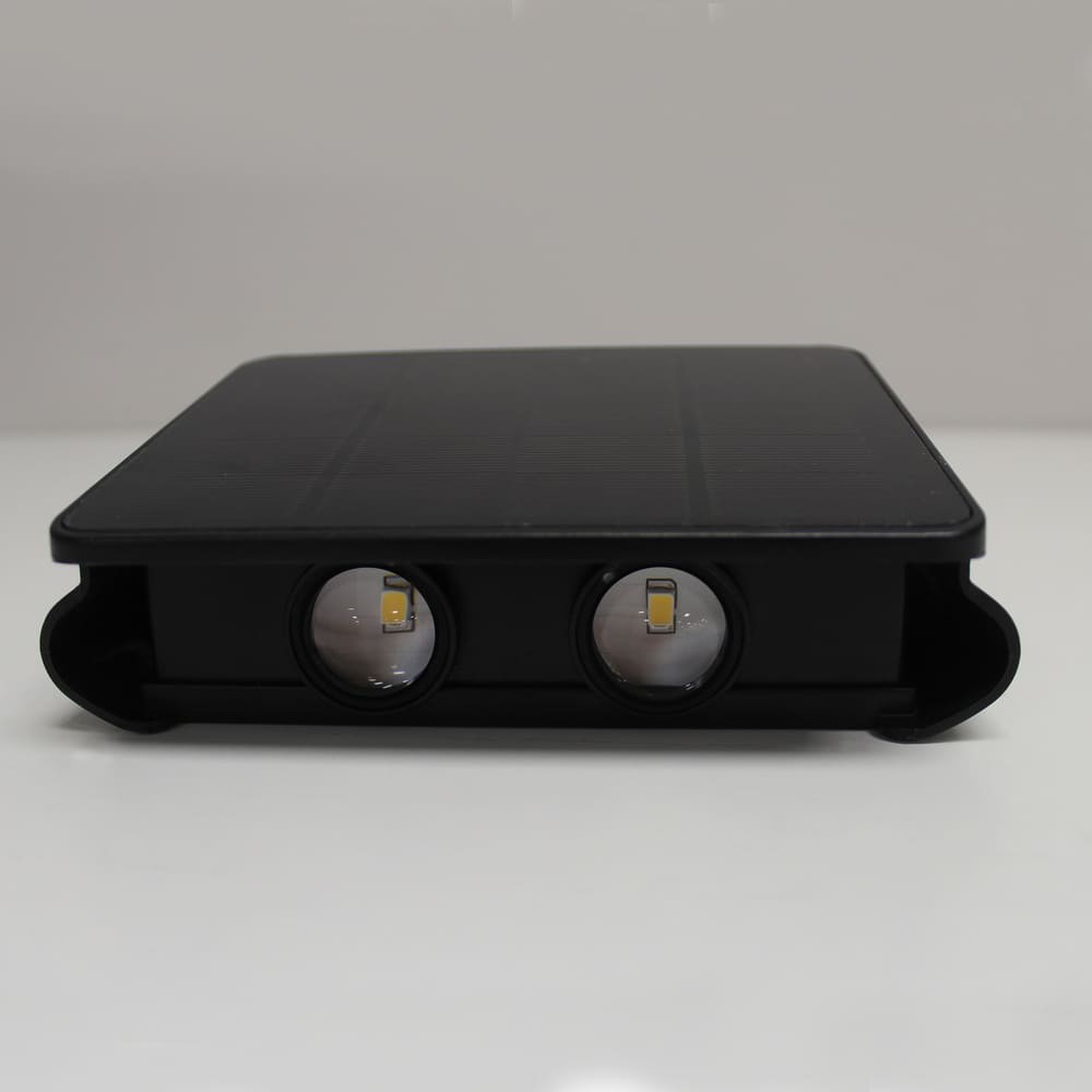 Aplique de pared solar LED Nil con luz arriba y abajo. Permite utilizarse sin consumo de luz al contar con un panel solar para cargar la batería durante el día. El aplique cuenta con sensor crepuscular y memoria de encendido. Iluminación LED integrada con temperatura de color blanca cálida (3000K), emitida hacia arriba y hacia abajo del aplique. Interruptor ON/OFF situado en la parte trasera del aplique.