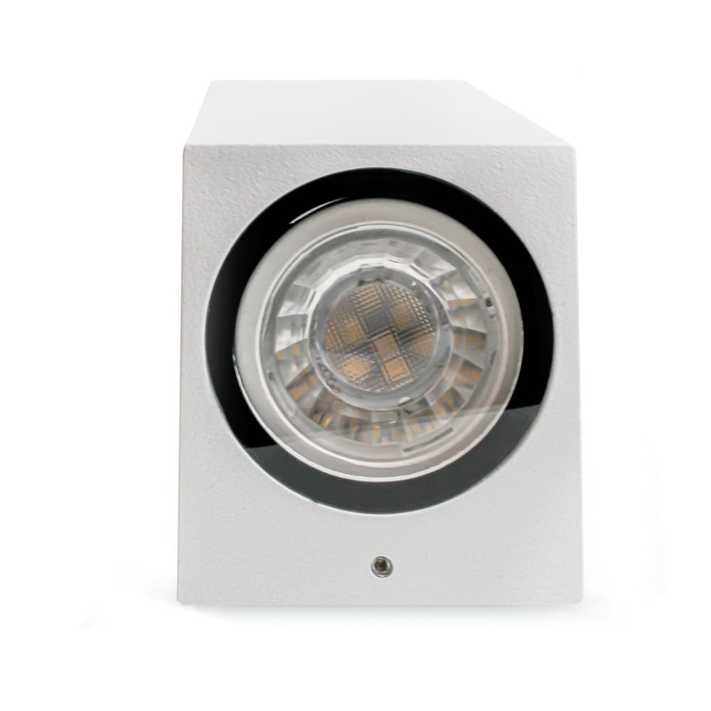 Aplique de pared para iluminación de exterior e interior. Fabricado en aluminio, tiene forma rectangular con acabado lacado en blanco mate. Resistente a salpicaduras con IP44. Fácil de instalar. El aplique Confo puedes encontrarlo disponible con una luz o con dos, para bombillas GU10 no incluidas.
