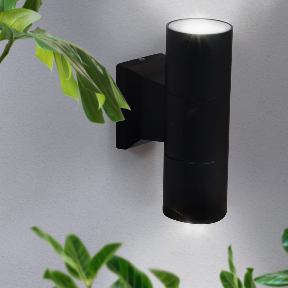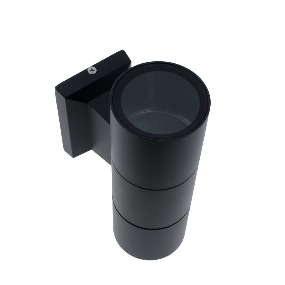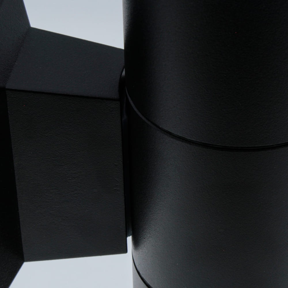 Aplique de pared con dos luces apto para tanto para paredes de interior como de exterior de terrazas, jardines y porches. Resistente al agua con IP44. Aplique cilindrido fabricado en aluminio con acabado negro texturizado mate. Para bombillas GU10. El modelo Relax esta disponible con una o dos luces. Muy facil de instalar y reemplazar las bombillas (no incluidas).