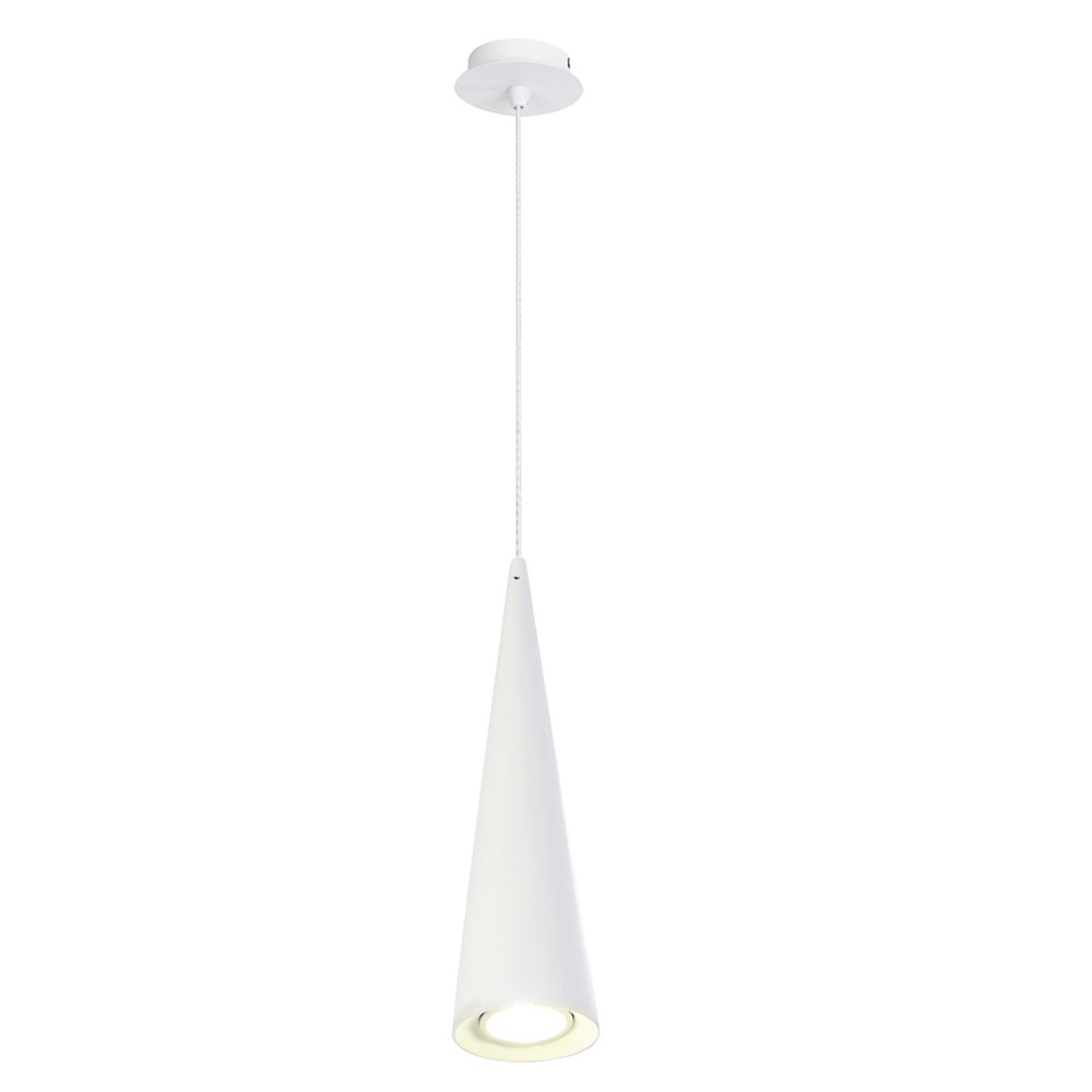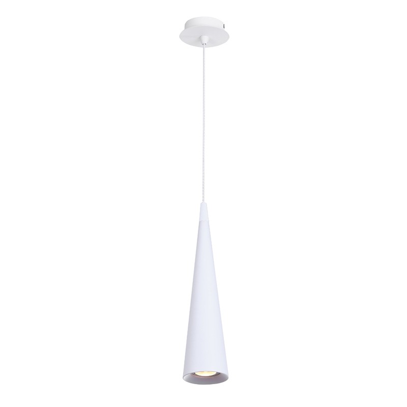 Modernos portalamparas colgante de hierro con acabado en blanco texturizado para bombilla GU10, no incluida y cable blanco. El cono decorativo tiene un diametro de 80mm, alcanzando una altura máxima de 1,3 metros.