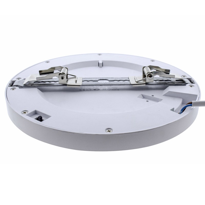 Downlight de superficie LED de 18W. Elija la temperatura de iluminación antes de instalarlo. Puede instalarse como plafón o un empotrable ajustándose a agujeros de 5 a 21 cm, incluso agujeros irregulares o cuadrados, gracias a sus pinzas desplazables y de fácil instalación. El marco del downlight es blanco, pero puede añadirle un aro decorativo niquel imantado fácil de instalar.