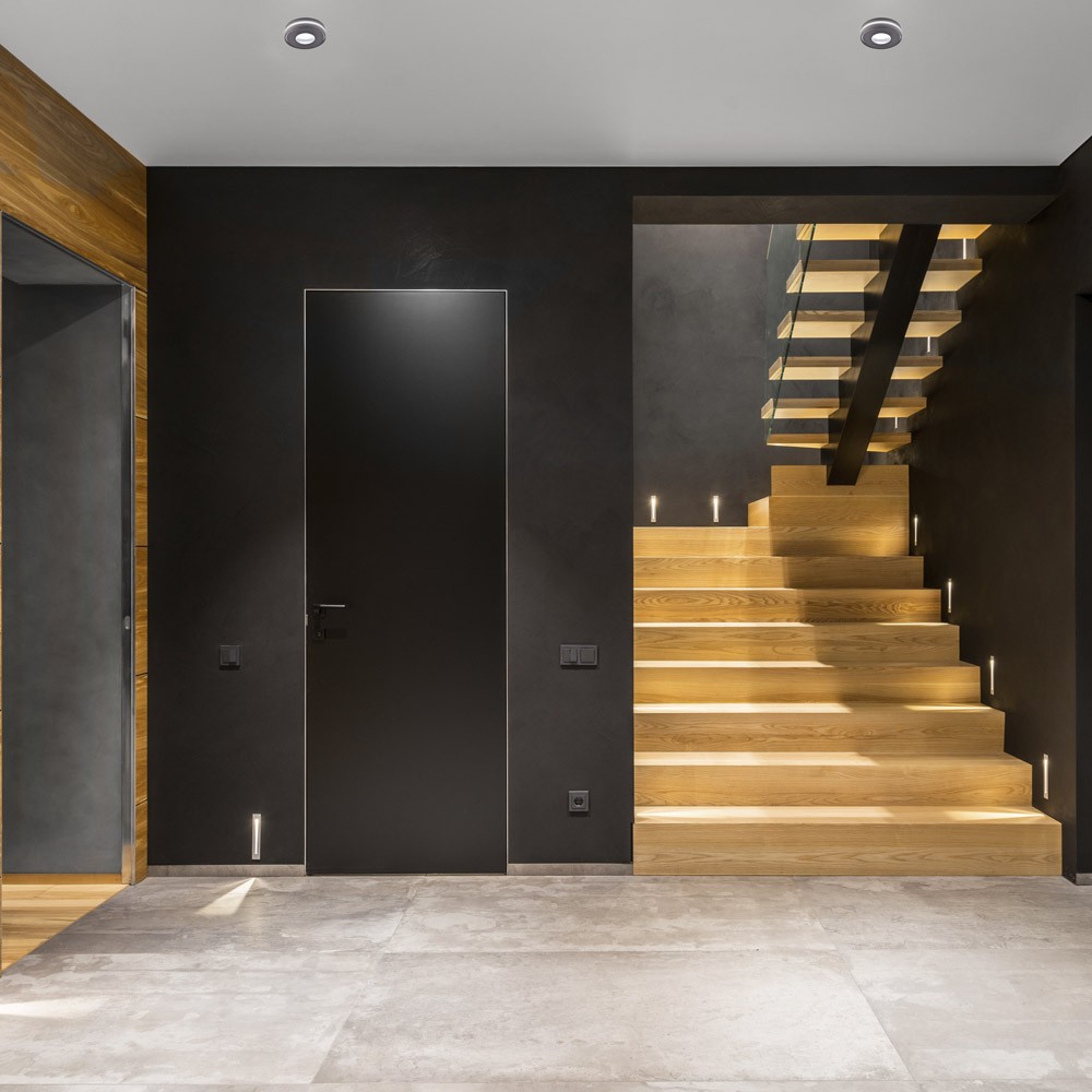 Empotrable de techo con punto de luz fijo. Capacidad para colocar una bombilla GU10 LED que se proyecta directamente hacia abajo. La luz se proyecta de manera decorativa a través del difusor de PC alrededor del empotrable. Empotrable circular de color negro muy práctico para instalar en el techo de salones, recibidores y otros espacios de interior. Hueco taladro: 70mm.