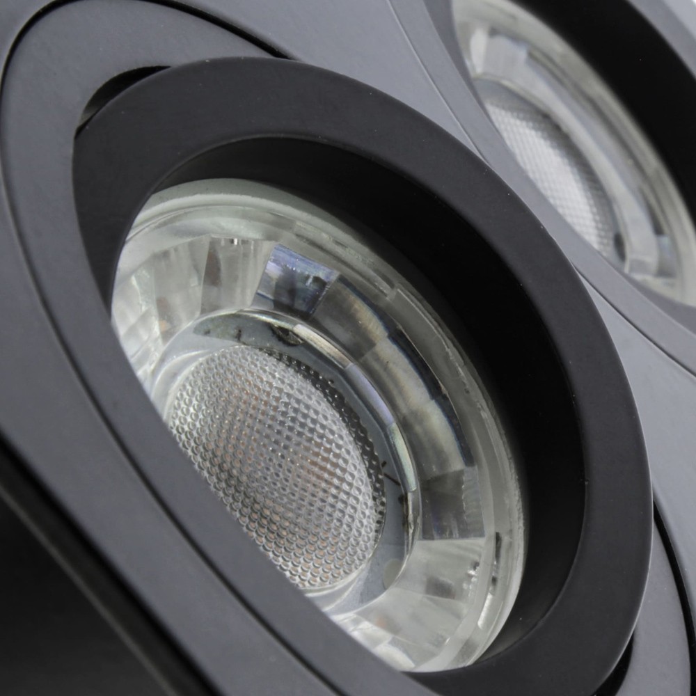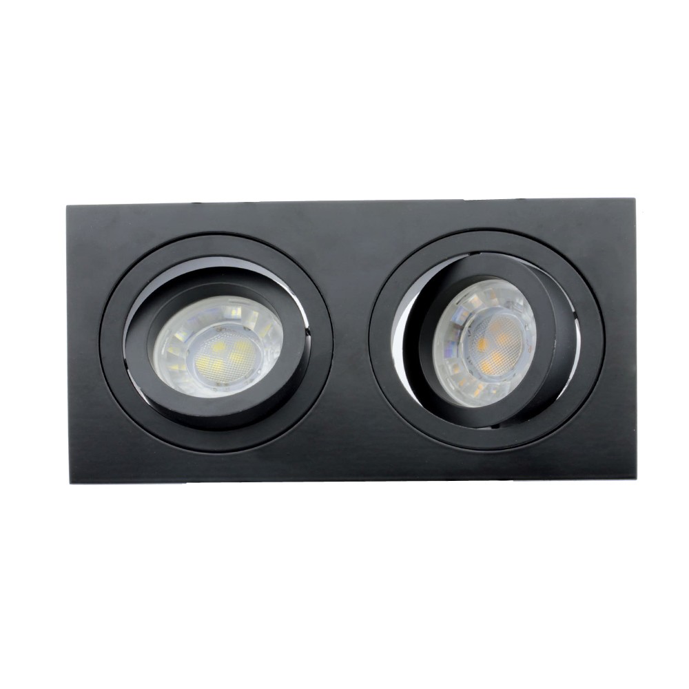 Foco rectangular para empotrar en falsos techos, con dos luces basculantes 30° y con reemplazo de la bombilla por la parte delantera. Estructura fabricada en aluminio pulido, lacado en negro mate. Incluye portalámparas GU10, bombillas no incluidas. Perfecto para iluminación en pasillos, salones, dormitorios, comercios, tiendas de moda, restaurantes, etc…