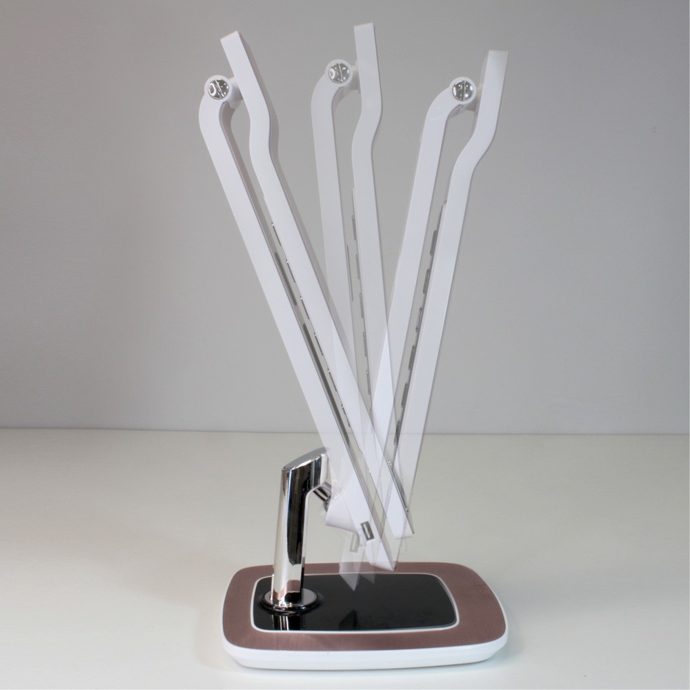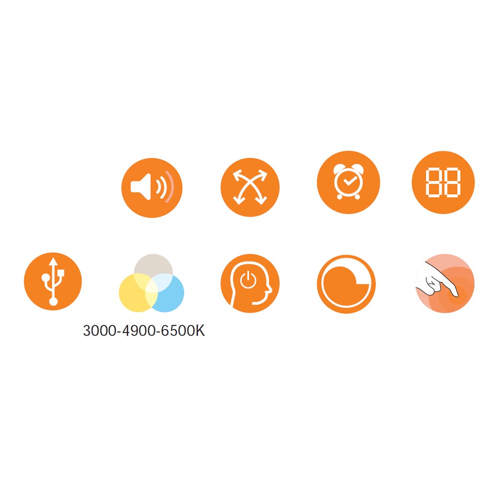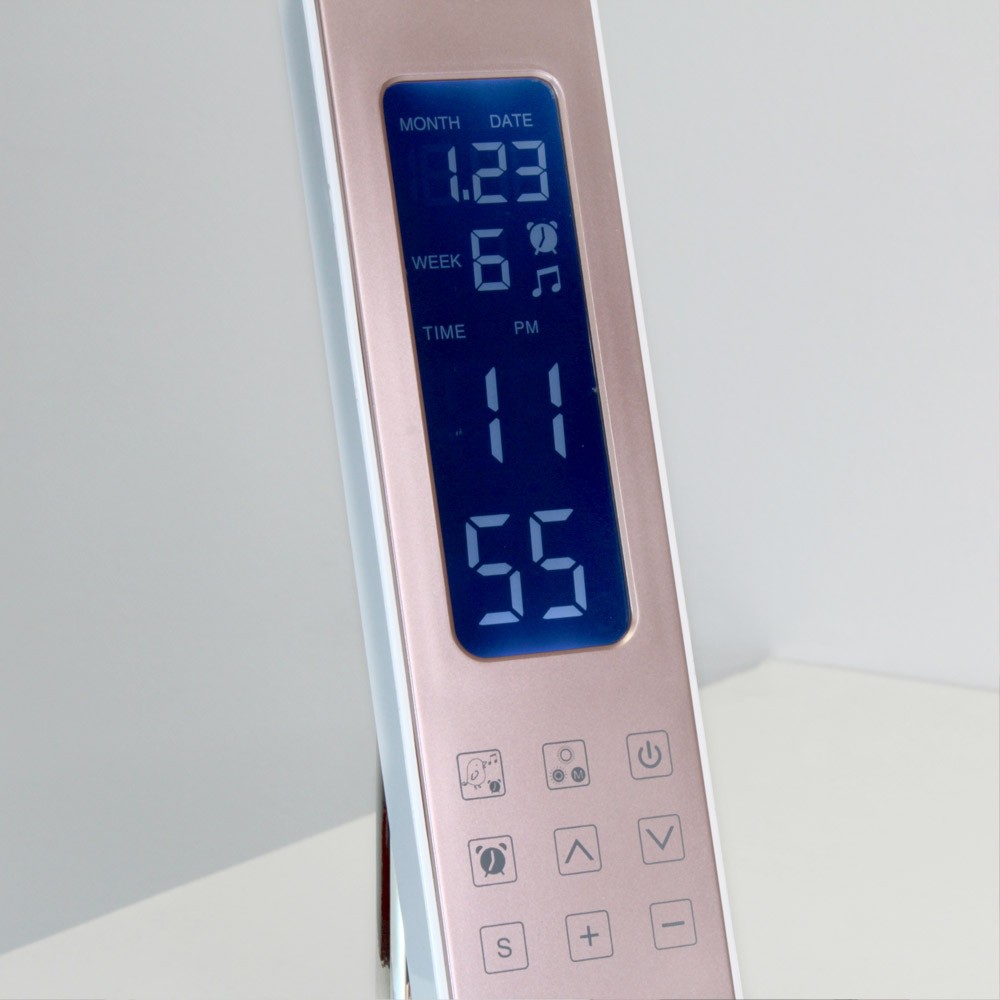 Flexo LED con alarma despertador y control táctil. Pantalla LCD digital con fecha y hora y puerto USB que permite cargar dispositivos electrónicos. Alarma despertador y prealarma (0-2-5-10-15 minutos) configurable para que las luces comiencen a encenderse de manera gradual acompañado de un sonido de pájaros. Tres tonalidades y 6 intensidades de luz para conseguir la iluminación perfecta en momento de estudio o de lectura.
