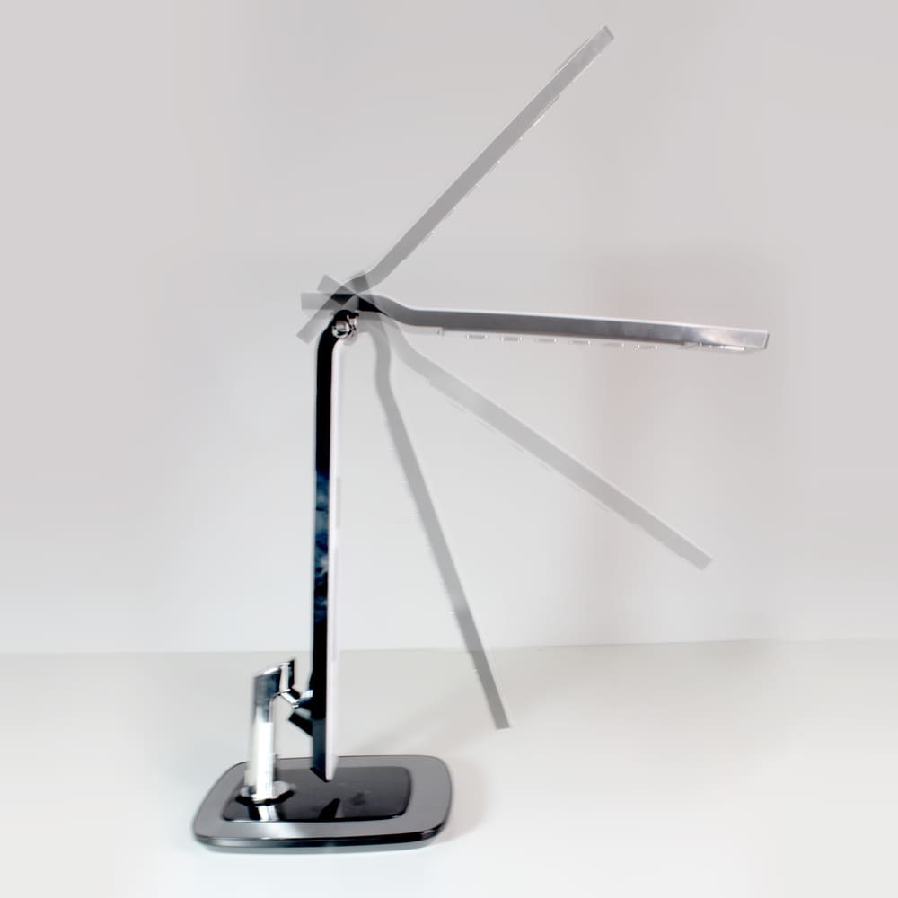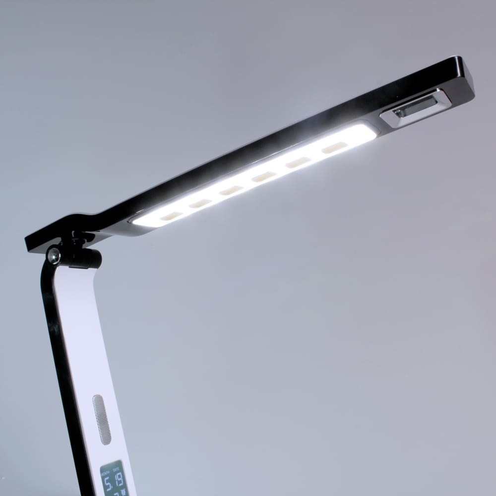 Flexo Led de 10W con tres tonalidades y 6 intensidades de luz. Permite establecer una alarma despertador y una prealarma. Pantalla LCD digital con fecha y hora y puerto USB que permite cargar dispositivos electrónicos. La prealarma puede establecerse 0-2-5-10-15 minutos antes de que suene la alarma, en su momento las luces comenzarán a encenderse de manera gradual acompañada de un sonido de pájaros. El flexo tiene el cuerpo y cabezal orientables. Es táctil, muy sencillo de utilizar con los botones de debajo de la pantalla.