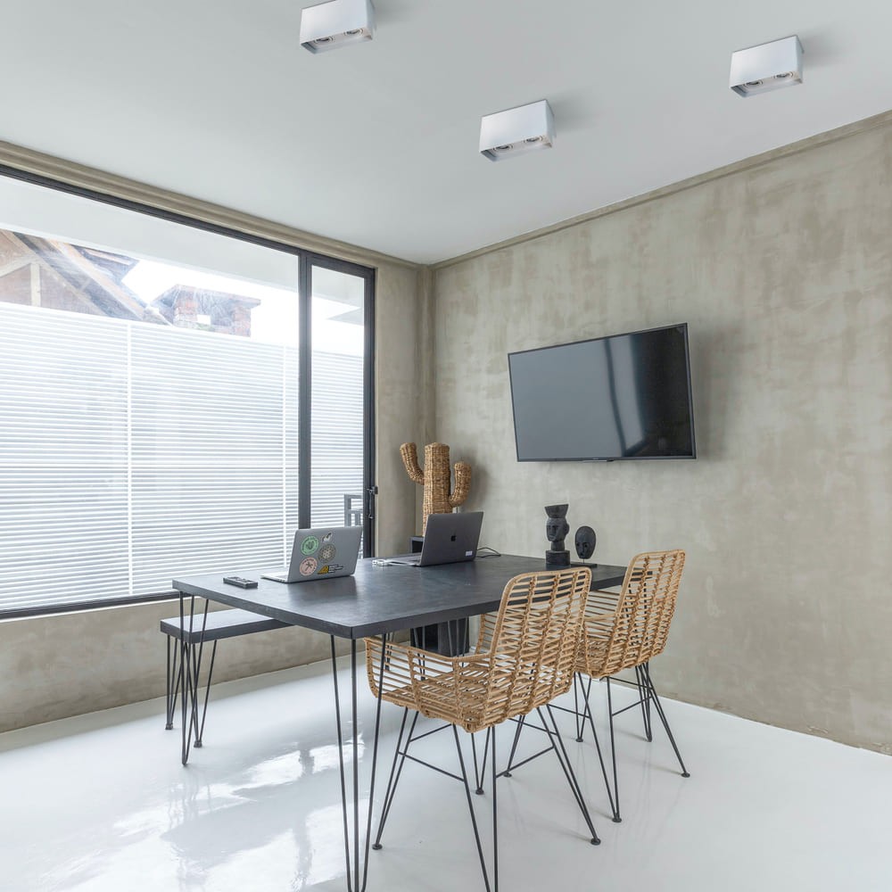 Foco de techo con dos luces basculantes, para bombillas GU10. Sencilla instalación en superficie con reemplazo de la bombilla por la parte delantera. Fabricado en aluminio con acabado blanco mate texturizado.