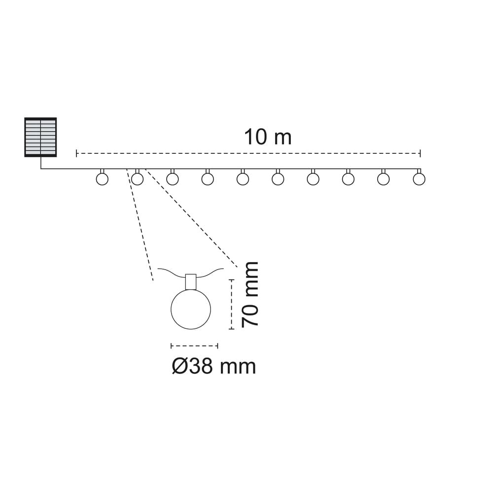 Guirnalda solar para iluminación exterior. Longitud de 10 metros con 10 puntos de luz (bombillas LED E12) que suman una potencia LED de 4W. Cuenta con batería recargable mediante un panel solar o con cable USB, con una autonomía de hasta 6 horas. Guirnalda LED con panel solar diseñada para iluminar jardines y terrazas en hogares, restaurantes y hoteles.