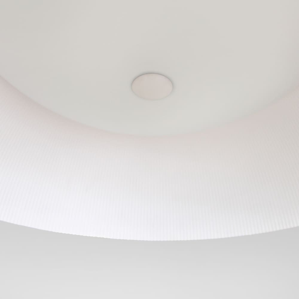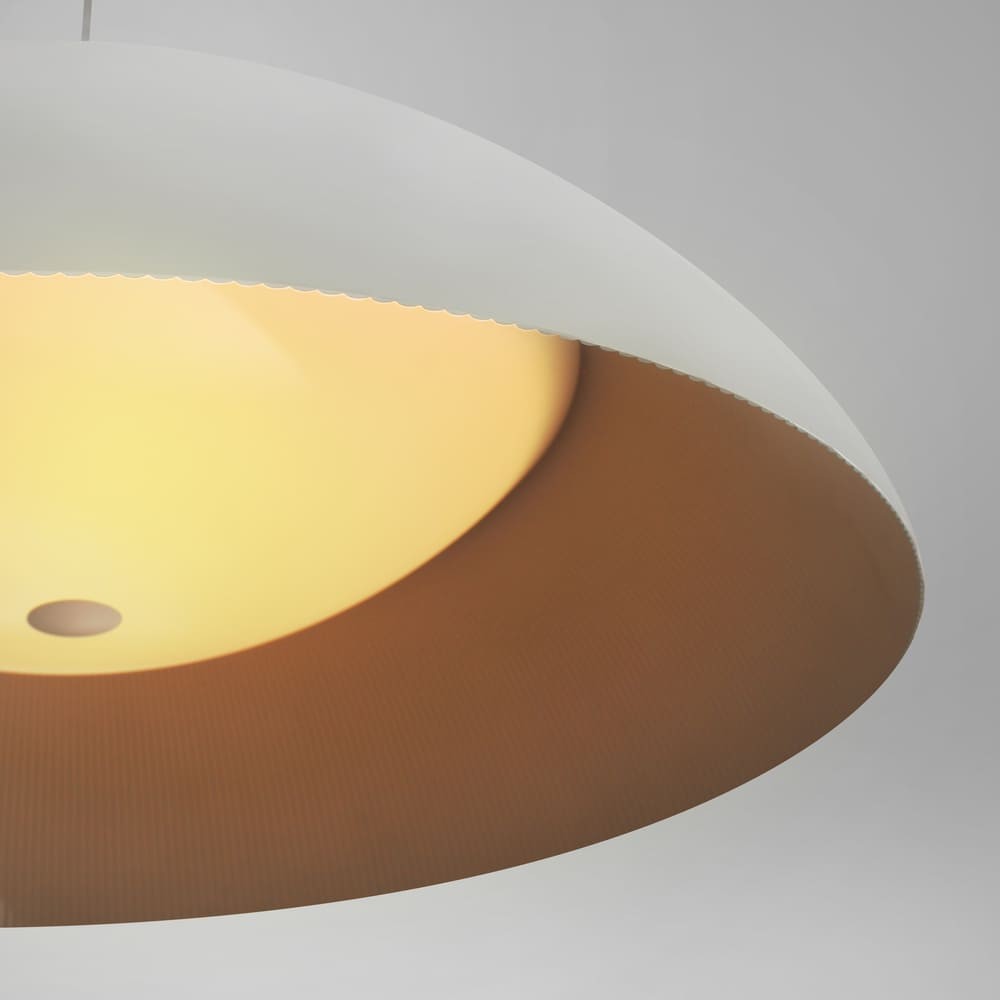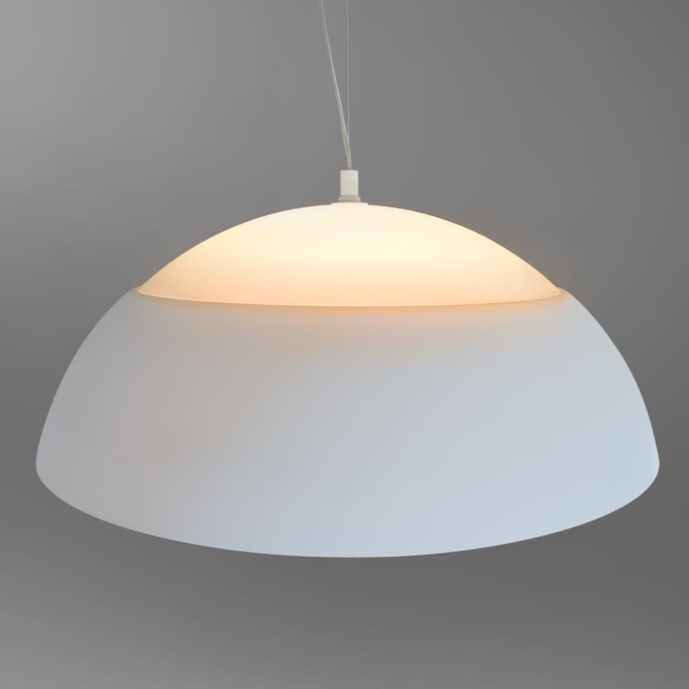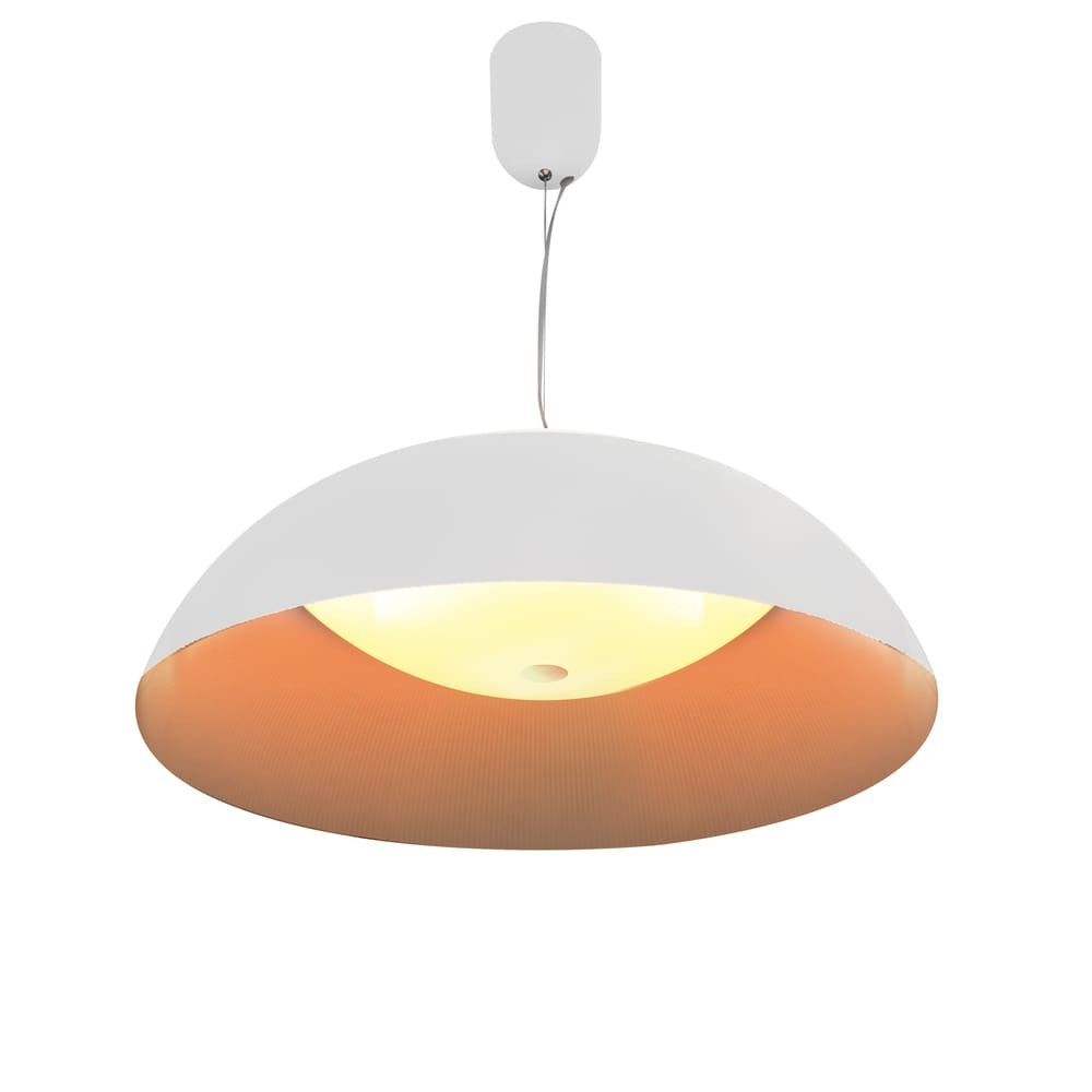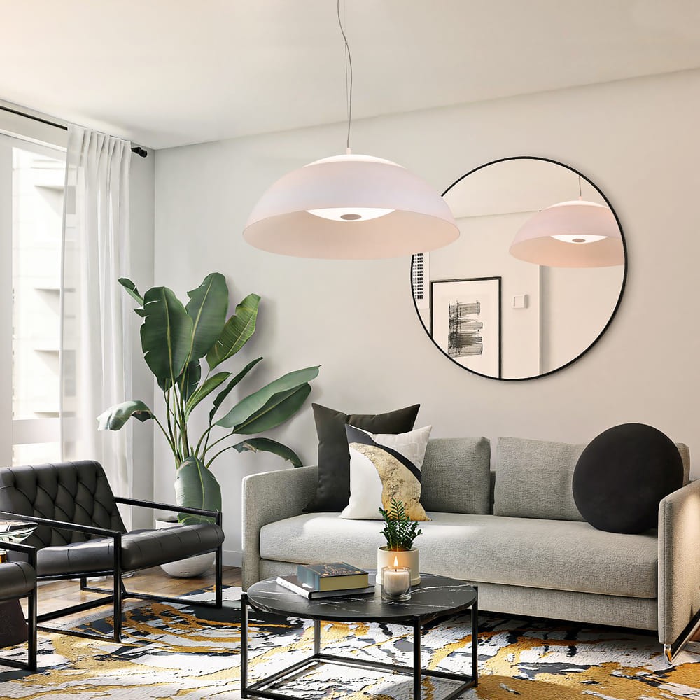 Lámpara colgante LED Mirta de 60W. Lámpara de techo con pantalla de cúpula perfecta para utilizar como iluminación principal en un salón. La luz se proyecta por la parte interior de la pantalla de manera indirecta y a través de la parte superior de la cúpula. Lámpara de techo de aluminio de color blanco, con luz led cálida integrada. Ideal para salones y cocinas de estilo moderno.