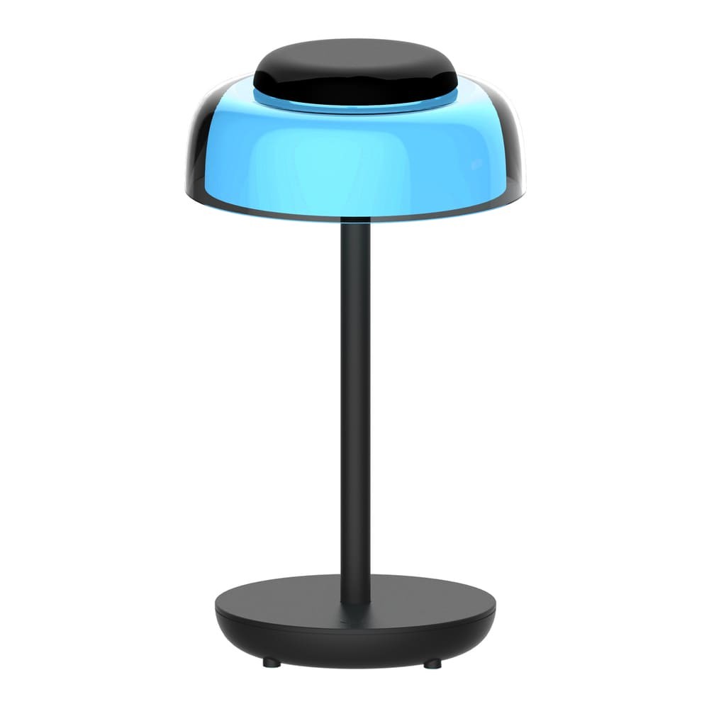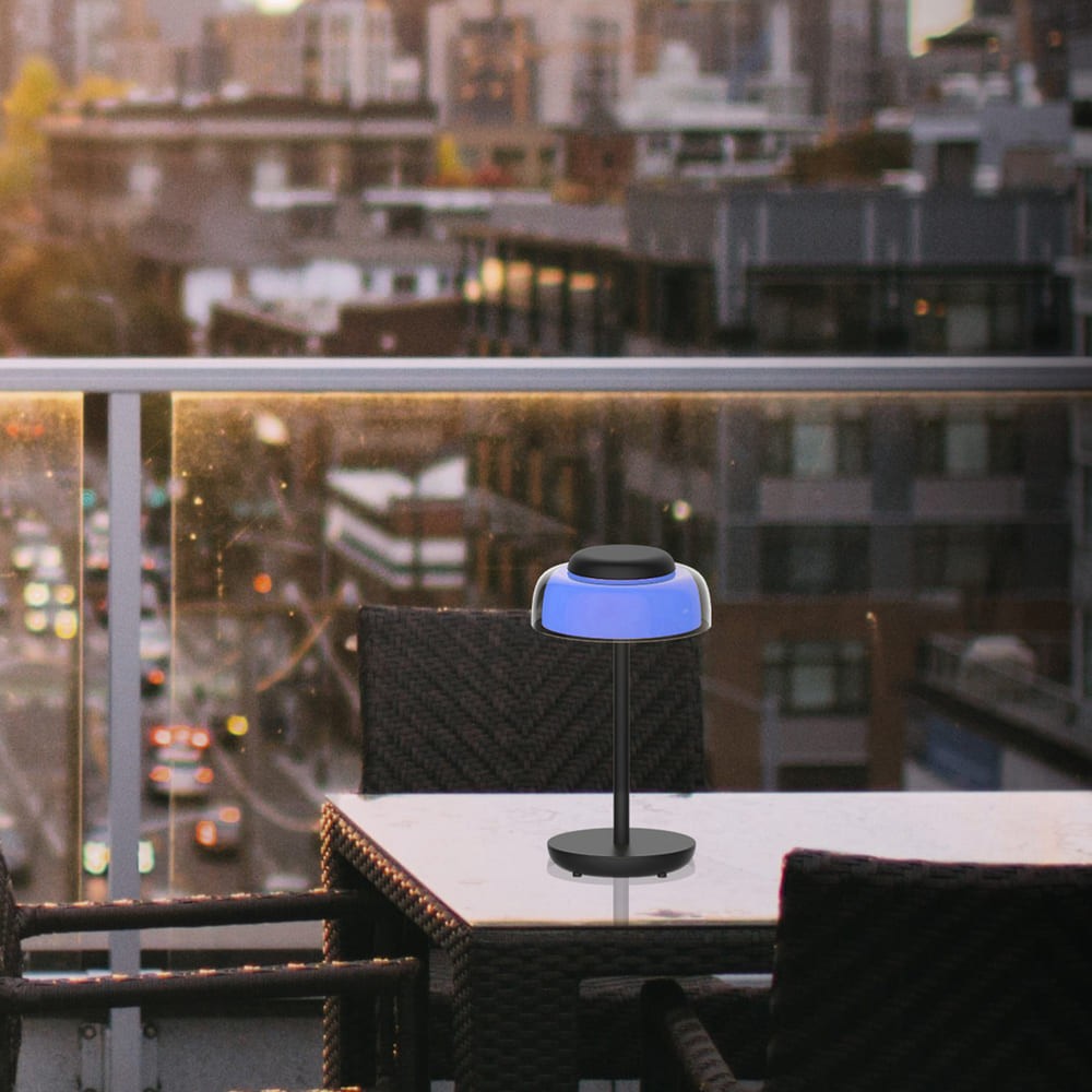 Lámpara de mesa con batería recargable para iluminación exterior. Lámpara de mesa ideal para crear una acogedora iluminación en cenas y reuniones al aire libre en la terraza o el jardín. Interruptor táctil en la base, intensidad de luz dimmable y modo RGB. Batería recargable con una autonomía de hasta 5 horas. Apta para utilizar en jardines, porches y terrazas.