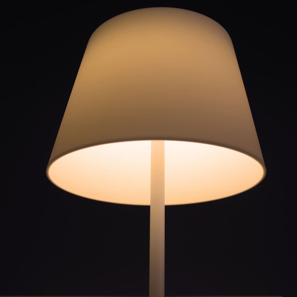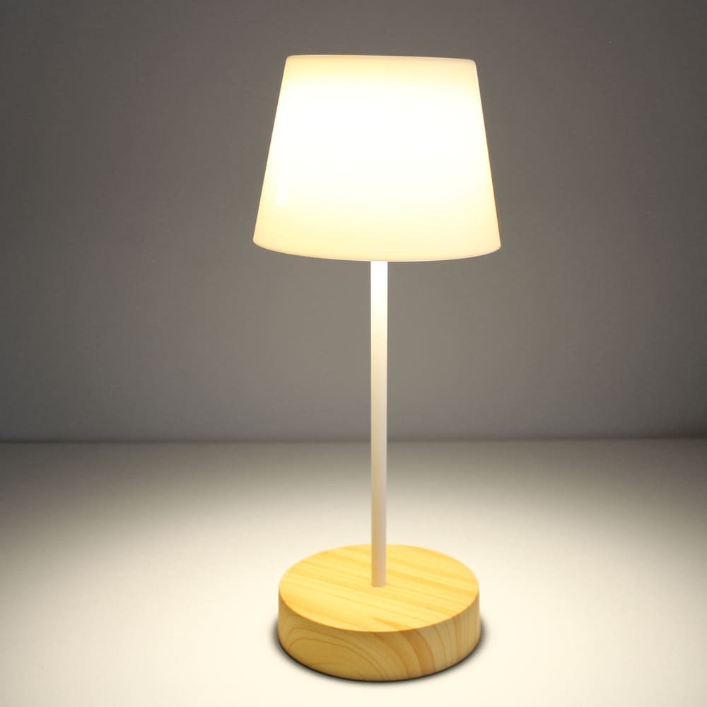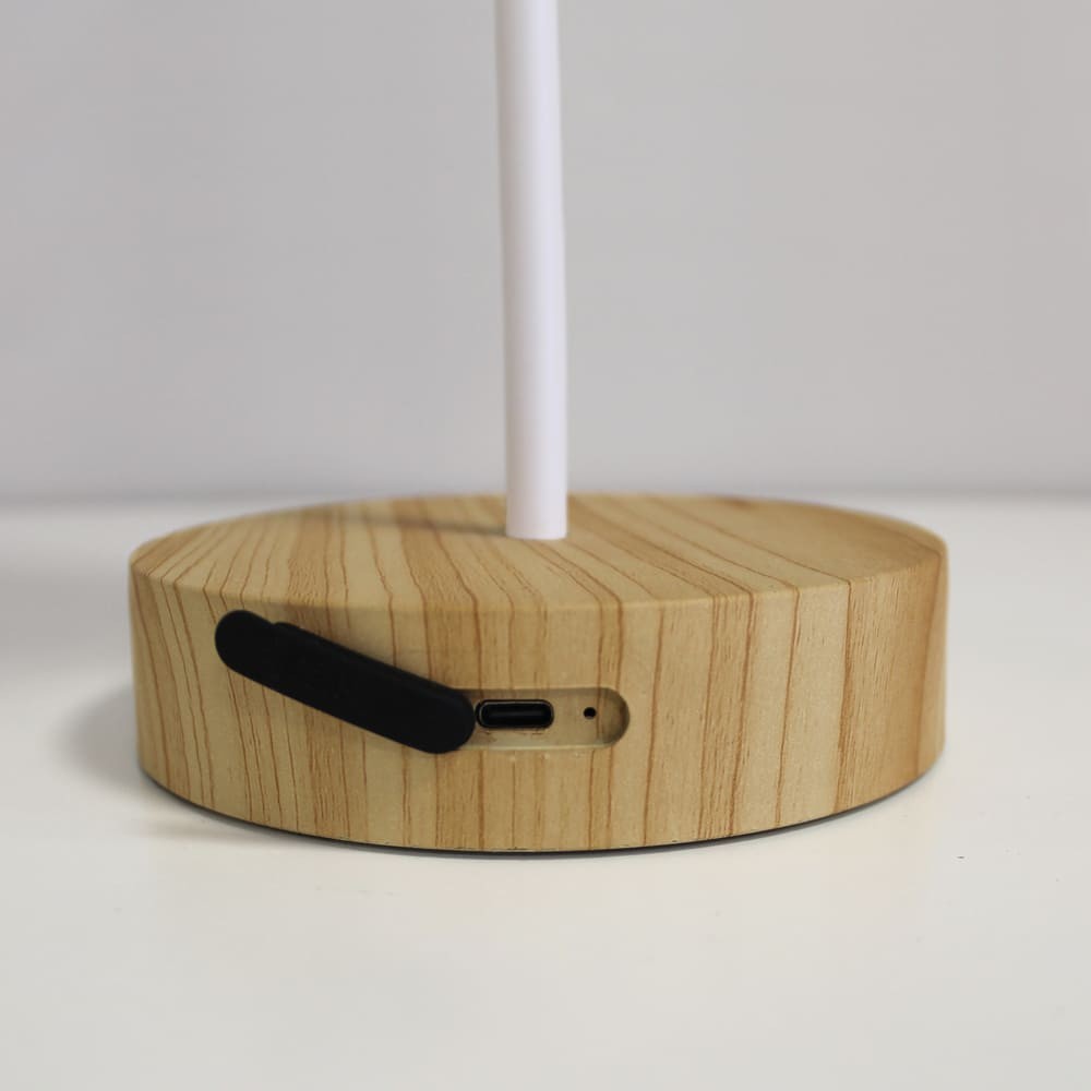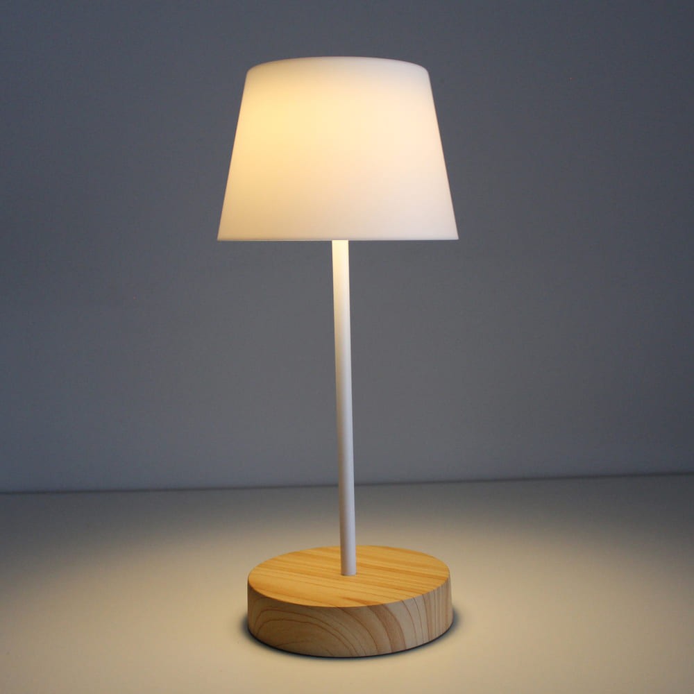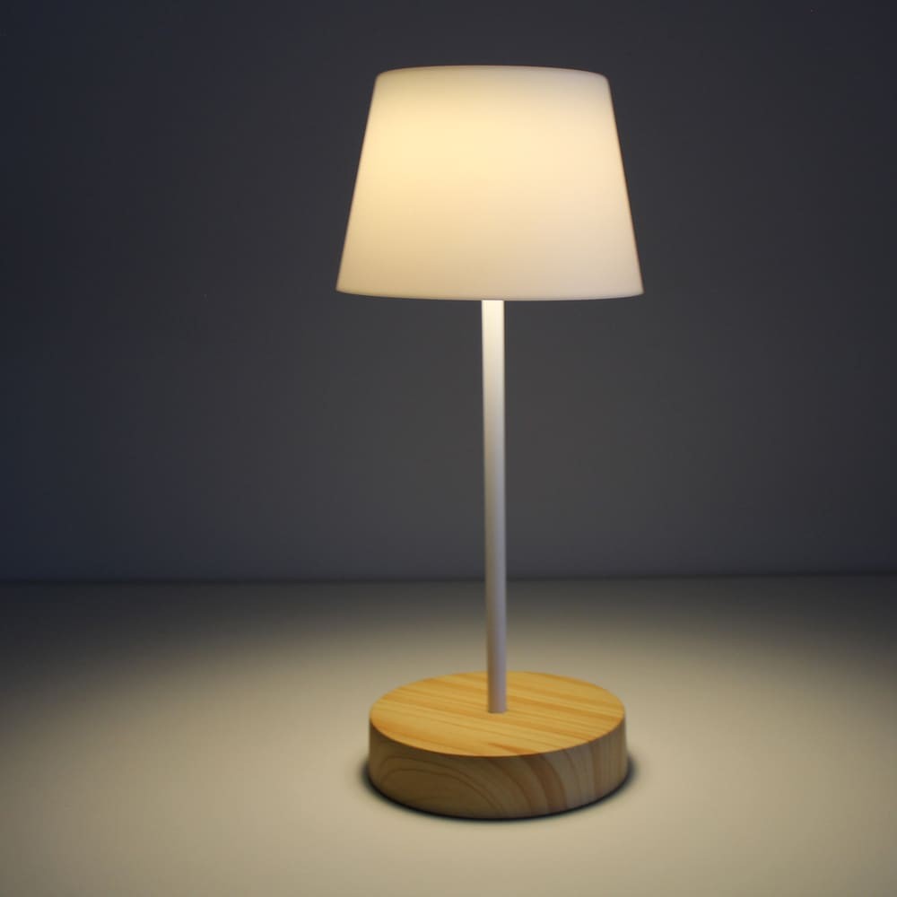 Lámpara de mesa con batería recargable para jardines y terrazas. Lámpara de mesa moderna diseñada para aportar una cálida iluminación en cenas y reuniones al aire libre. La luz se enciende de manera sencilla pulsando en la parte superior de la pantalla. Además, puedes cambiar la intensidad de lúmenes según el número de toques (100%-50%-10%-OFF). En la base tiene un puerto USB para cargar la batería de la lámpara (autonomía de hasta 10 horas). Lámpara de color blanco con base efecto madera y pantalla opal.