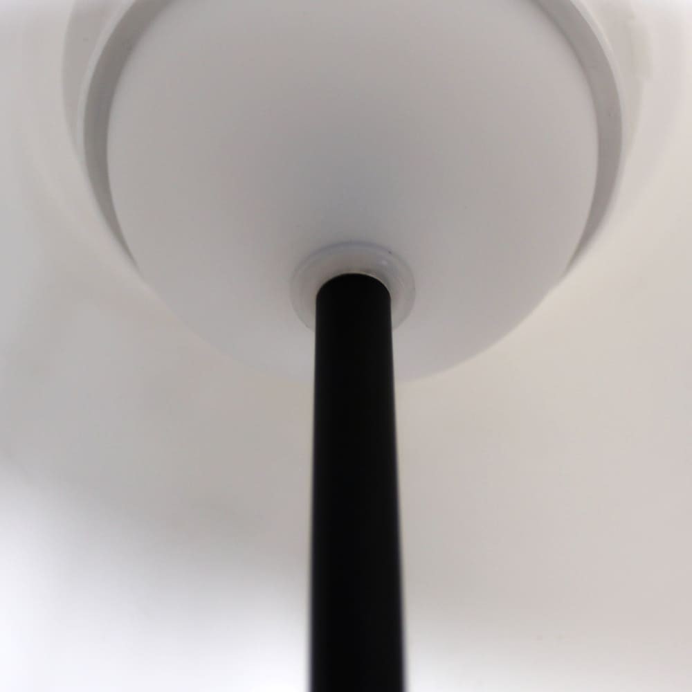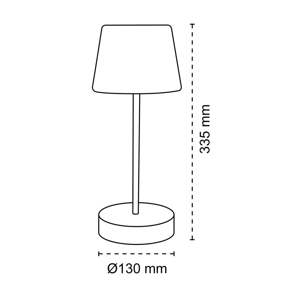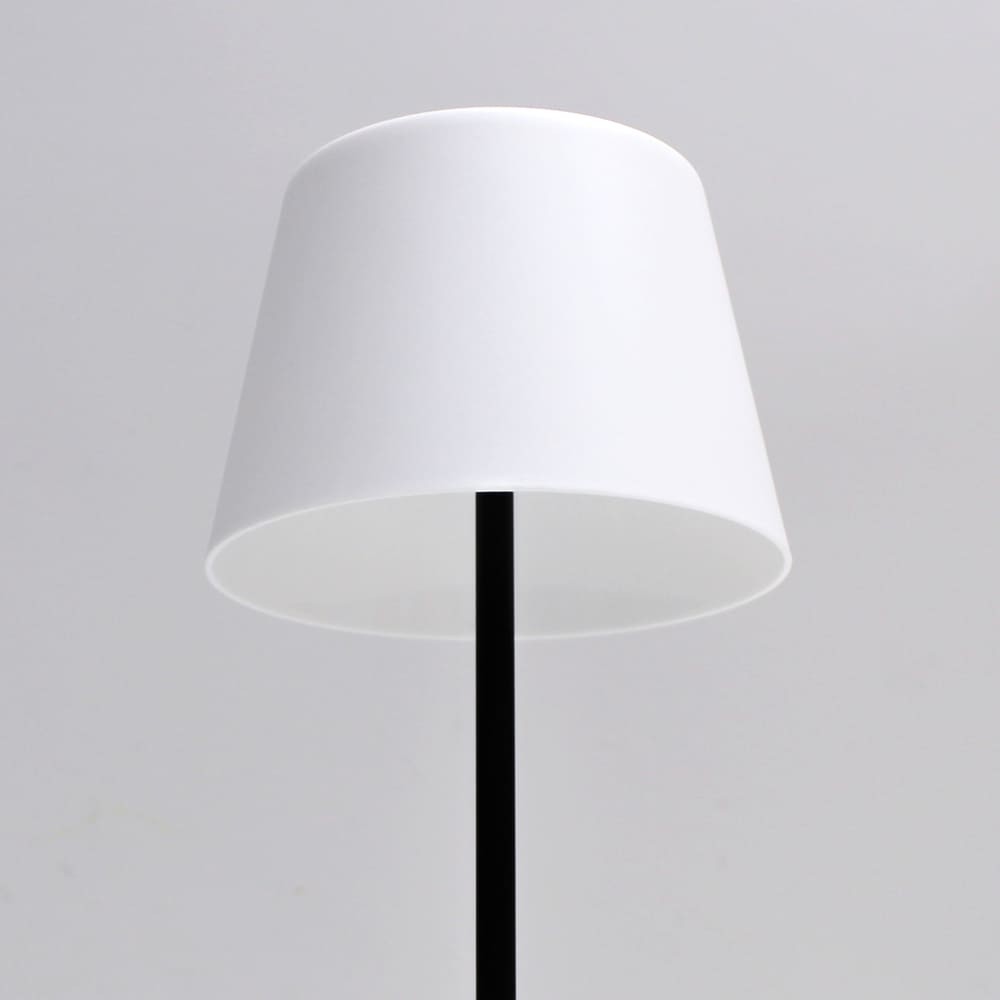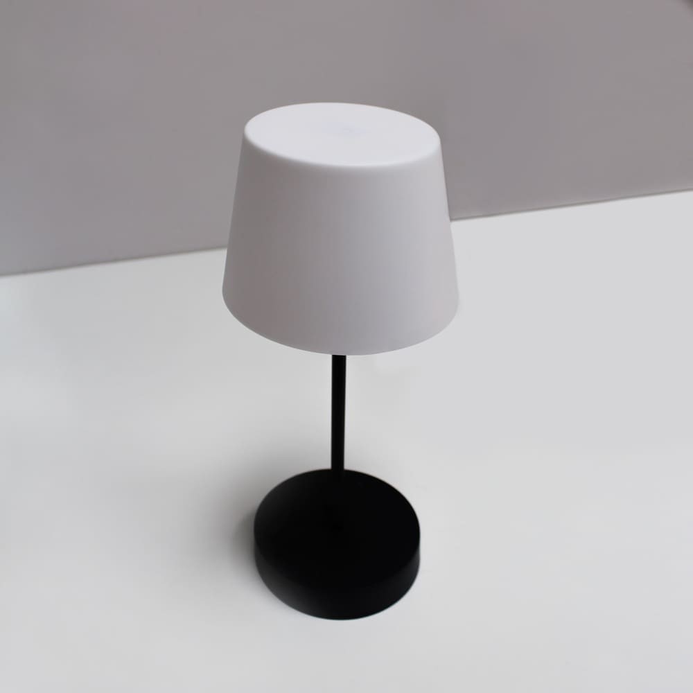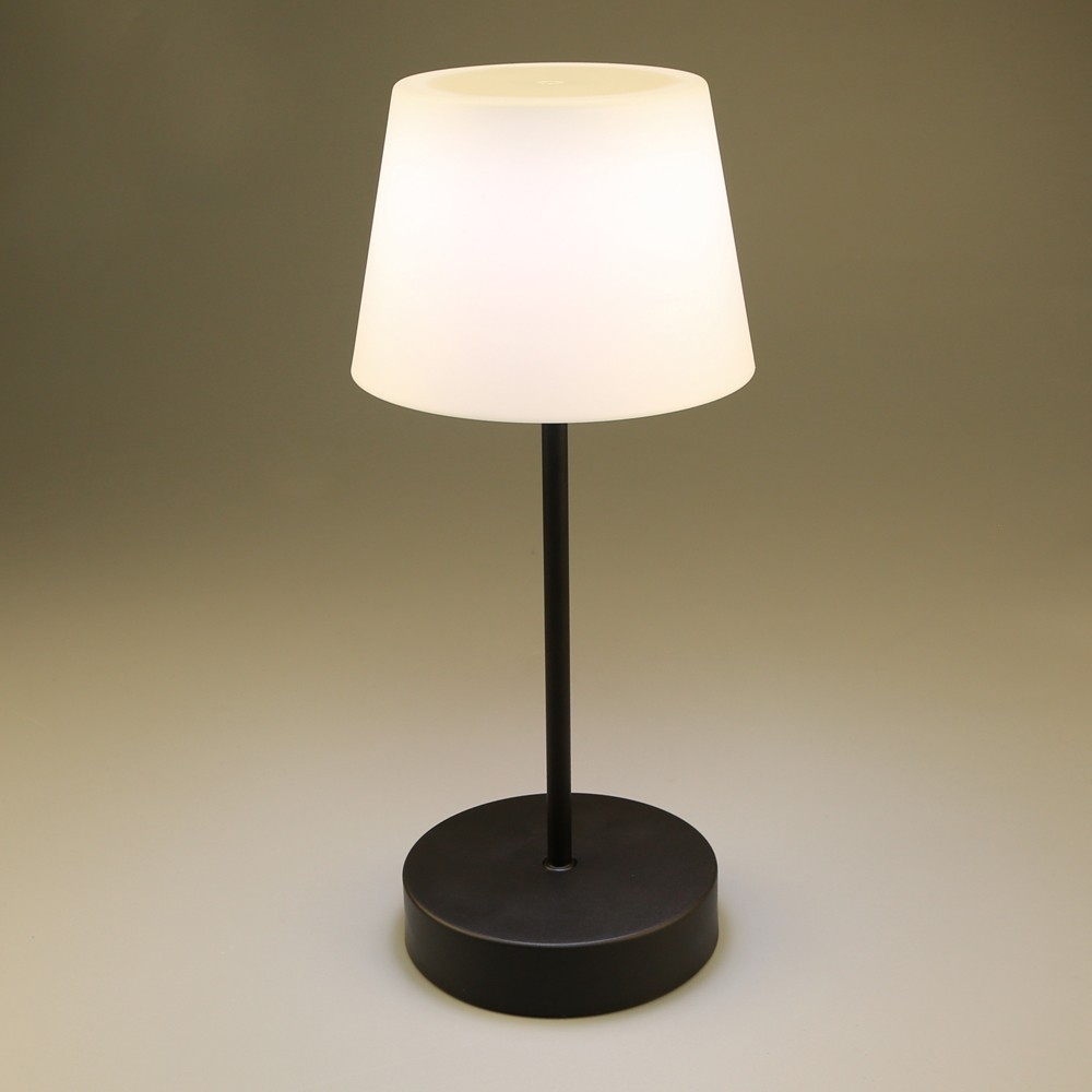 Lámpara de mesa con batería recargable para jardines y terrazas. Lámpara de mesa moderna diseñada para aportar una cálida iluminación en cenas y reuniones al aire libre. La luz se enciende de manera sencilla pulsando en la parte superior de la pantalla. Además, puedes cambiar la intensidad de lúmenes según el número de toques (100%-50%-10%-OFF). En la base tiene un puerto USB para cargar la batería de la lámpara (autonomía de hasta 10 horas). Lámpara de color negro con pantalla opal.