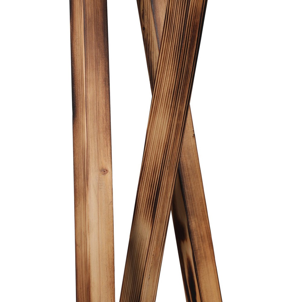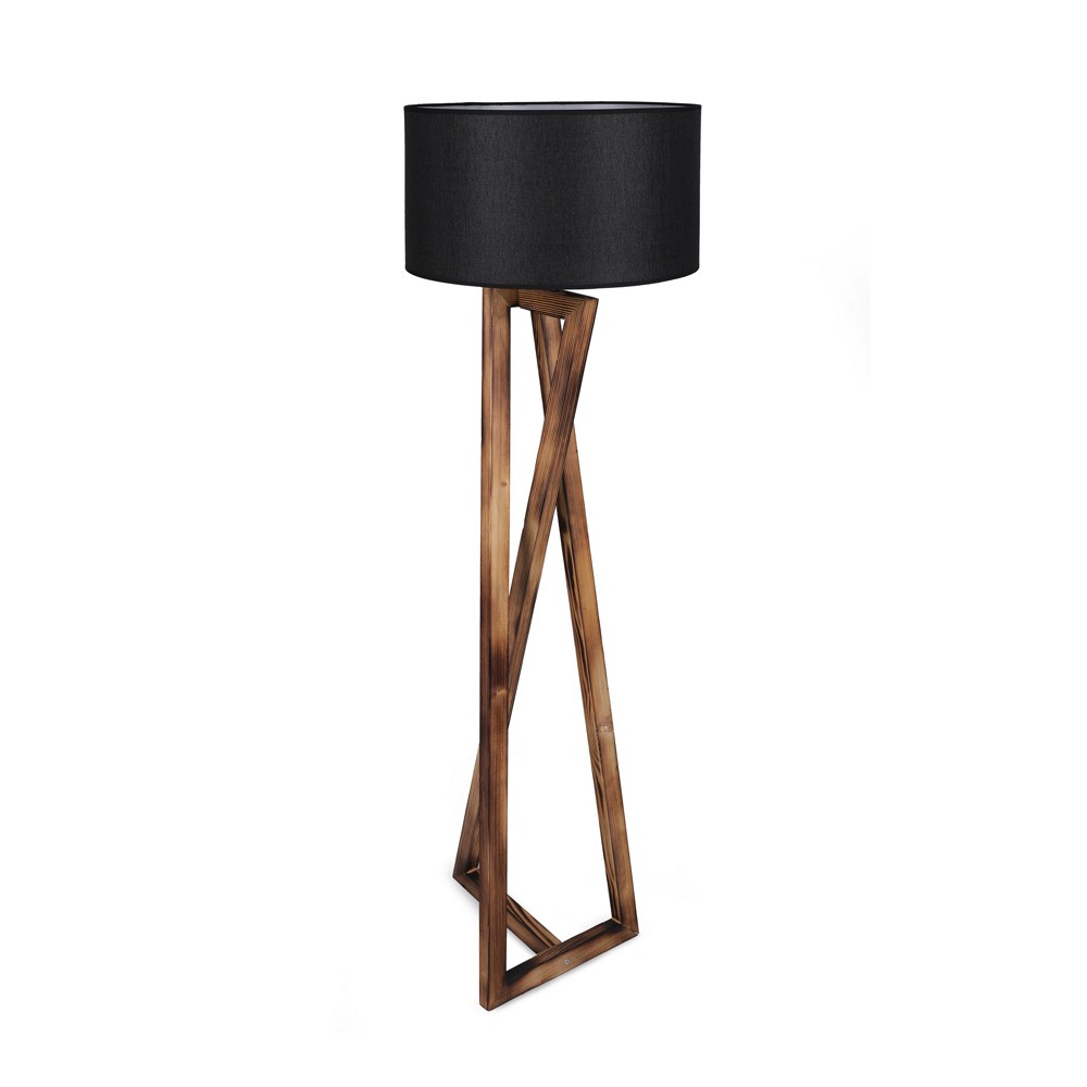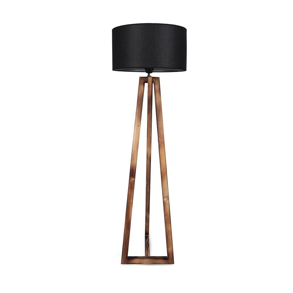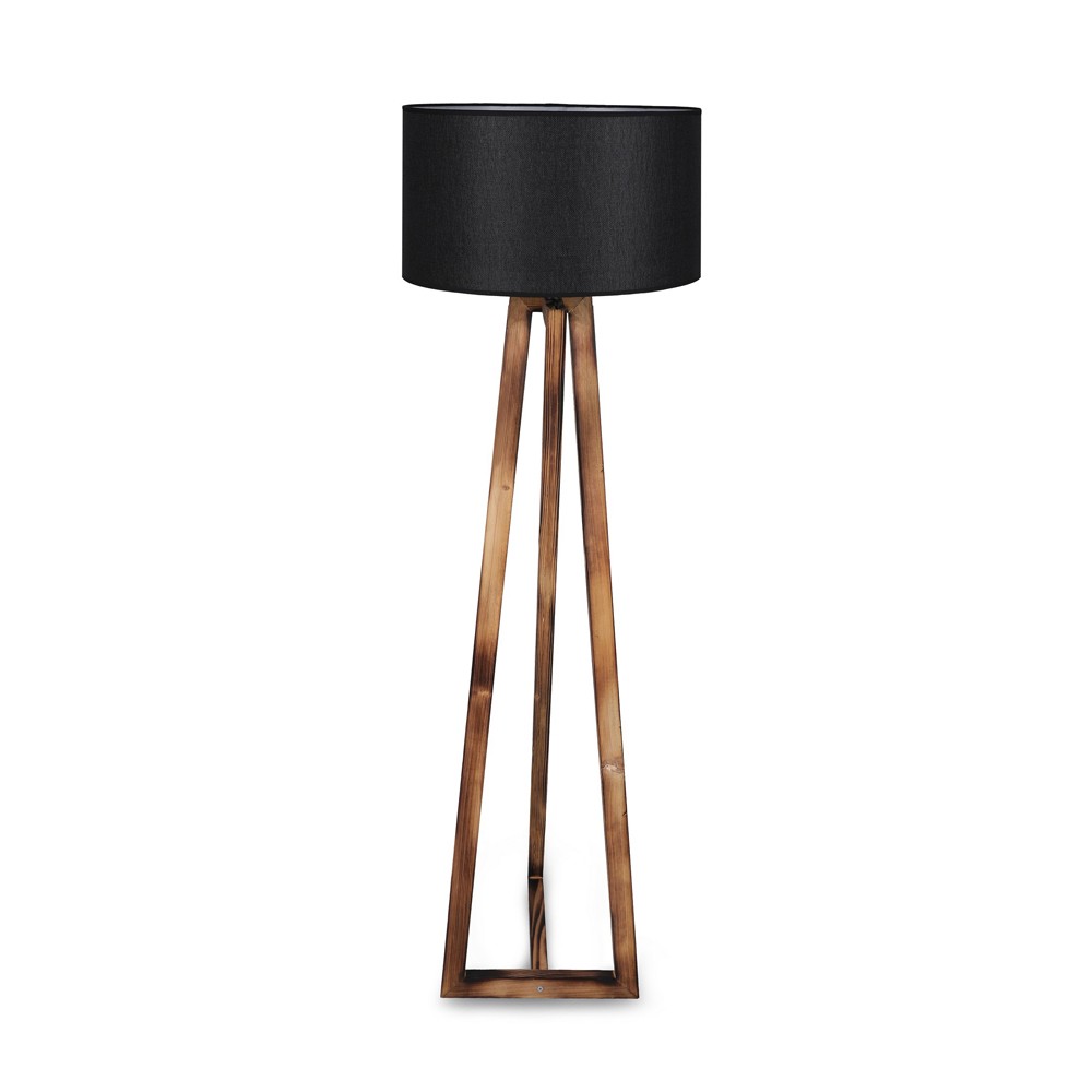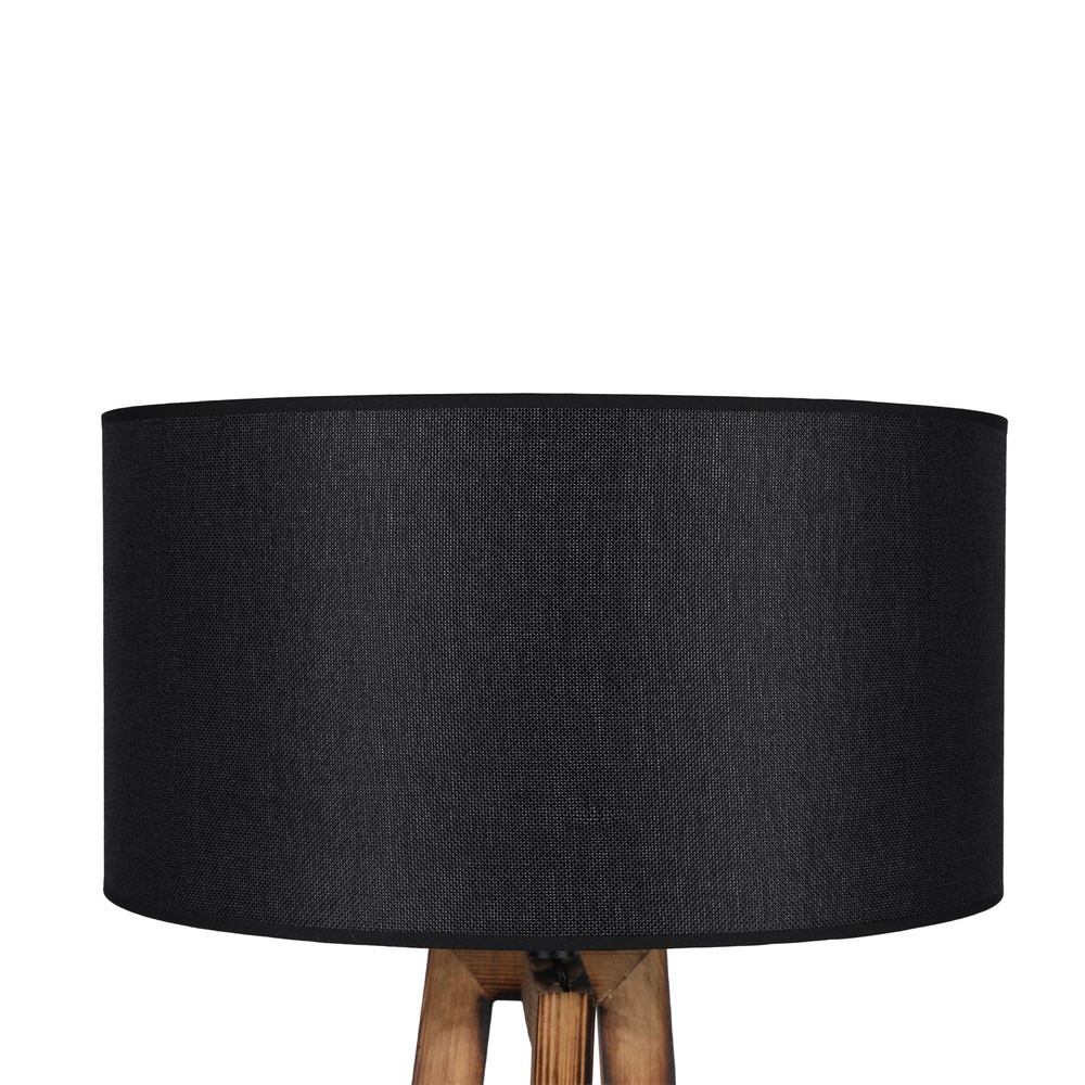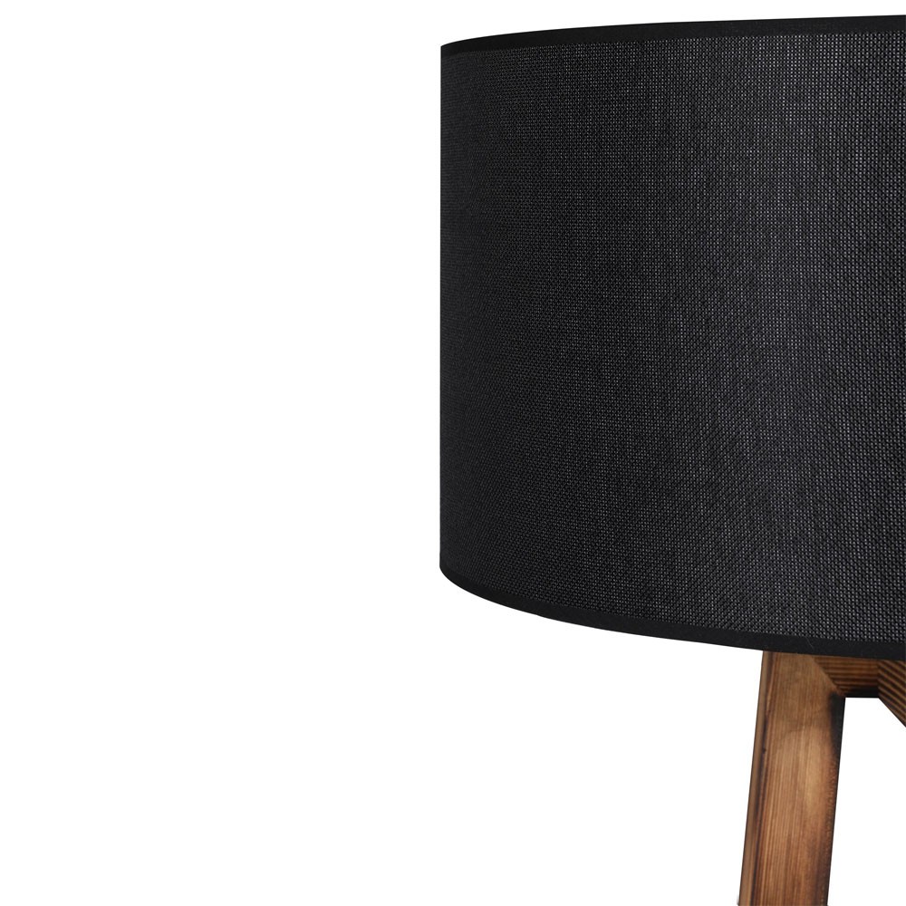Lámpara de pie con tres patas de madera con diseño geométrico de 166cm de alto y una base de 43cm. La pantalla de tela, disponible en gris claro y gris antracita, tiene un diámetro de 45cm y una altura de 24cm. Funciona con una bombilla E27 no incluida. El botón de encendido y apagado de la lámpara se encuentra en el cable.
