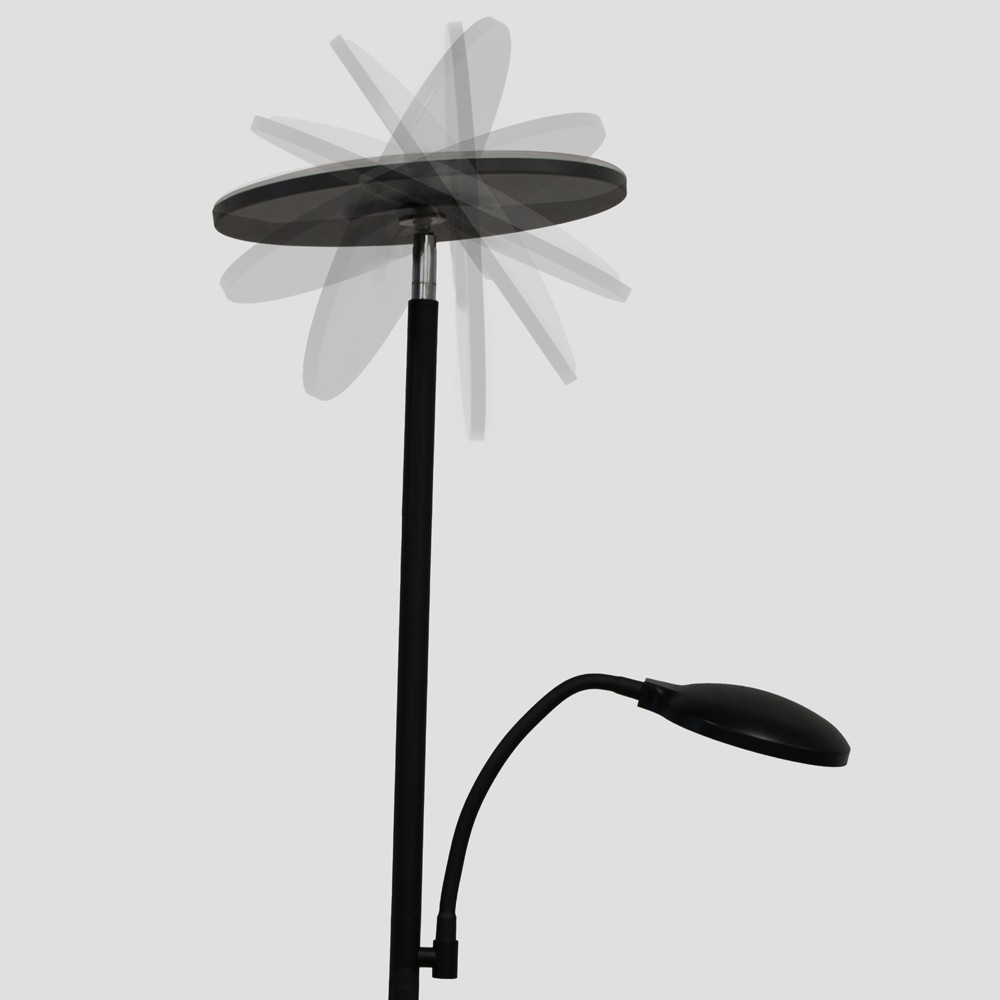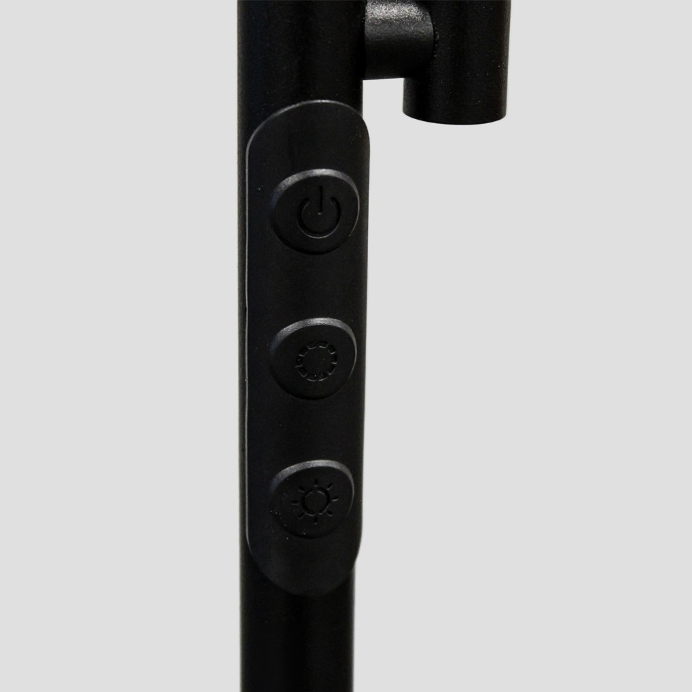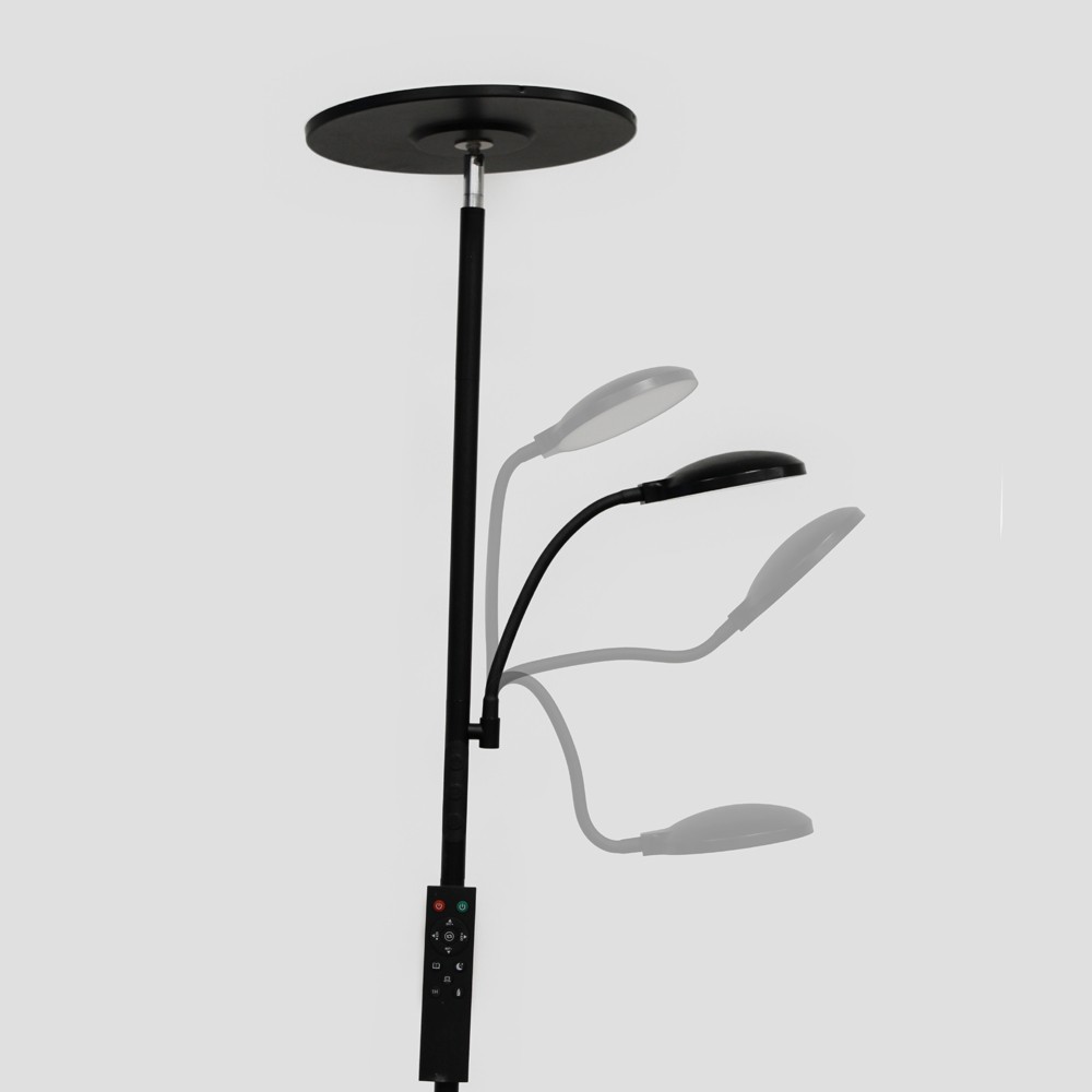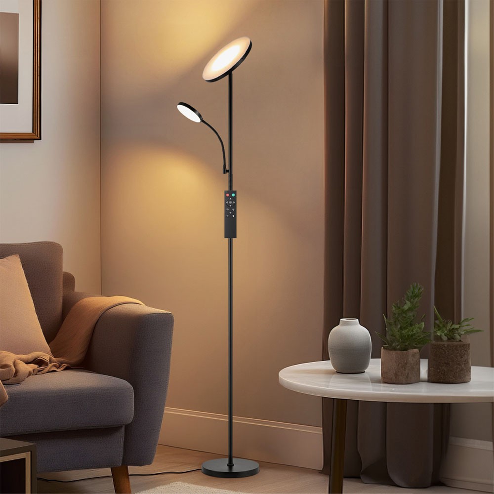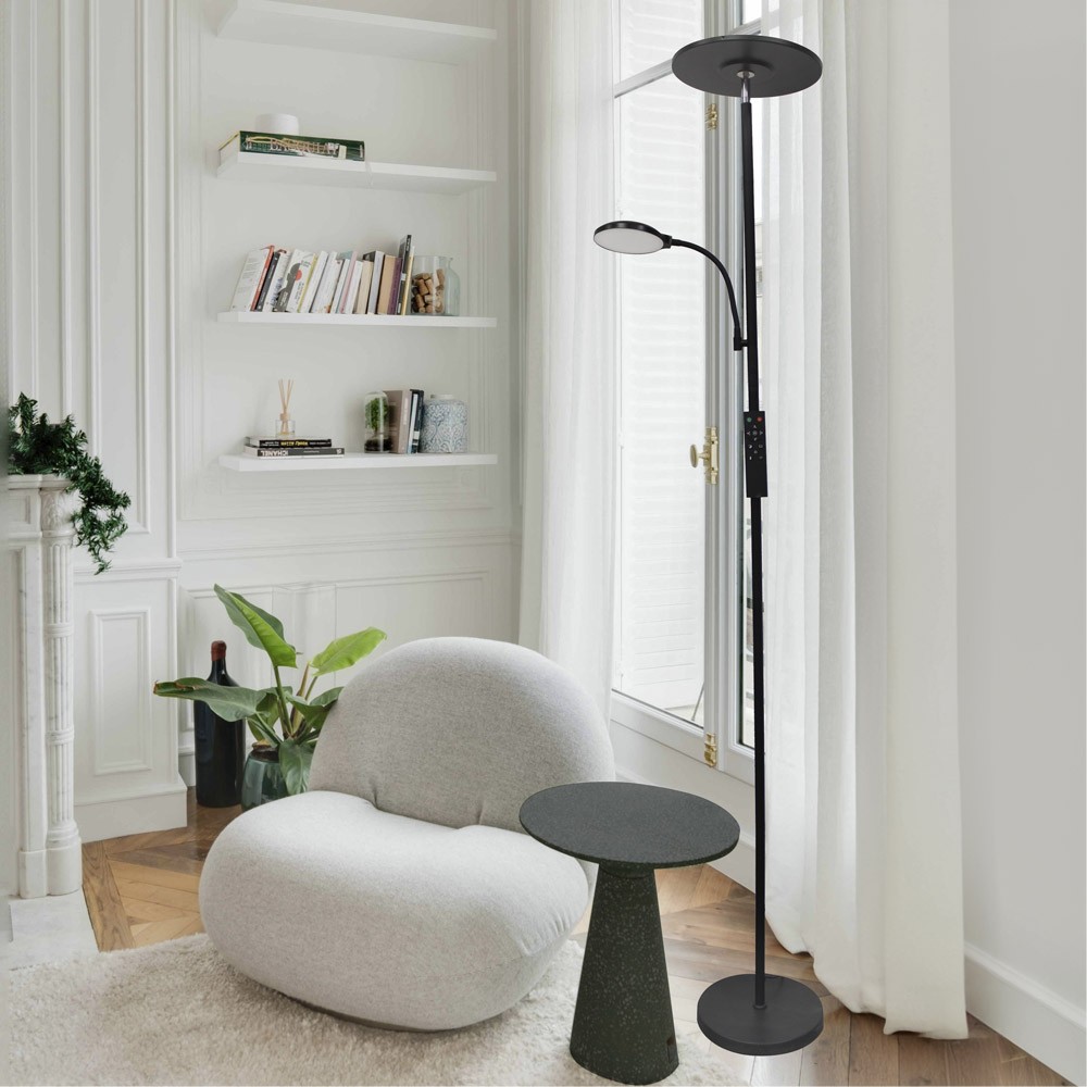 Lámpara de pie con brazo lector LED Vinet. Lámpara de pie muy práctica para utilizar tanto como iluminación ambiental como para lectura o auxiliar. Puedes regular tanto la intensidad de luz como la temperatura de color. Incluye mando a distancia para seleccionar varias configuraciones de luz e incluso programar el apagado (1H.). Lámpara de pie de color negro con iluminación LED integrada en tono blanco cálido (30W+6W).