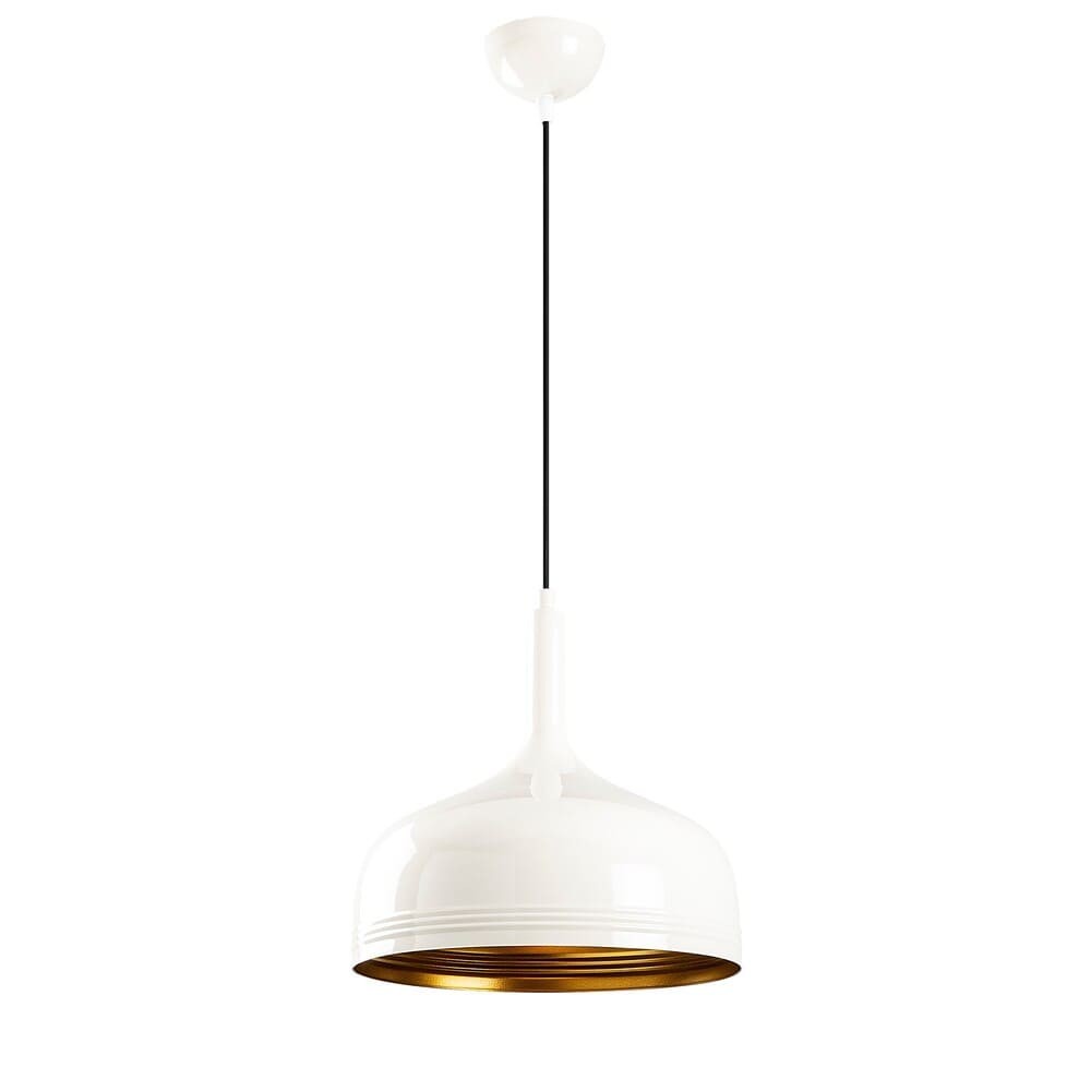 Lámpara decorativa colgante de techo con pantalla metálica blanco mate con el interior en dorado y cable blanco de 90 cm que puede acortarse. Permite crear diferentes composiciones de iluminación decorativa, adaptándose a diferentes espacios, al ajustar la altura de la lámpara. Para bombillas E27, no incluidas.