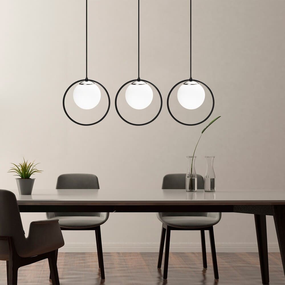 Lámpara decorativa colgante de techo con largura de cable ajustable. Diseño moderno formado por una tulipa de cristal blanco mate rodeada por un aro metálico negro. Permite crear diferentes composiciones de iluminación decorativa, adaptándose a diferentes espacios, al ajustar la altura de la lámpara. Perfecta para comedores, salones y dormitorios que buscan un estilo diferente en la iluminación. Para bombillas E27, no incluidas.
