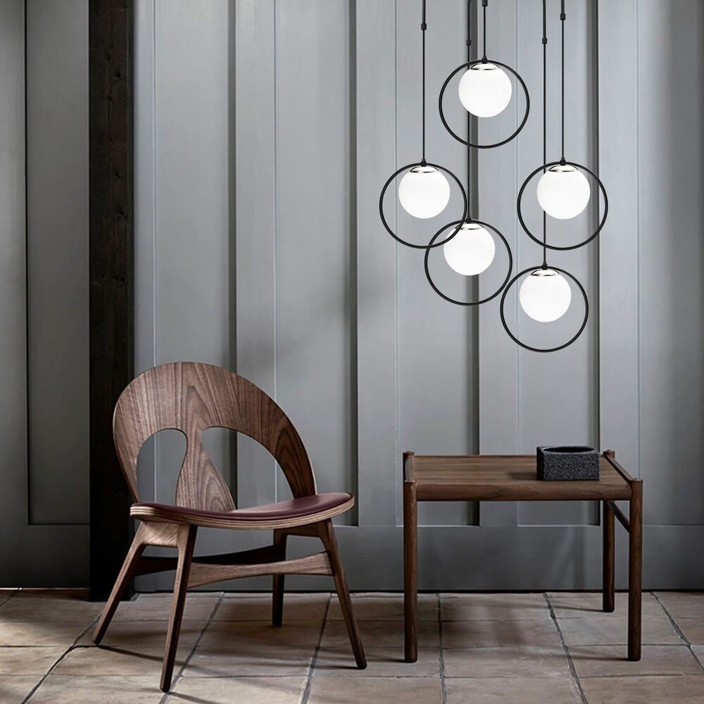 Lámpara decorativa de techo redonda con cinco luces colgantes con largura de cable ajustable. Las luces están formadas por una tulipa de cristal blanco mate rodeada por un aro metálico negro. Permite crear diferentes composiciones de iluminación decorativa, adaptándose a diferentes espacios, al ajustar la altura de los cinco puntos de luz. Perfecta para comedores, salones y dormitorios que buscan un estilo diferente en la iluminación. Para bombillas E27, no incluidas.