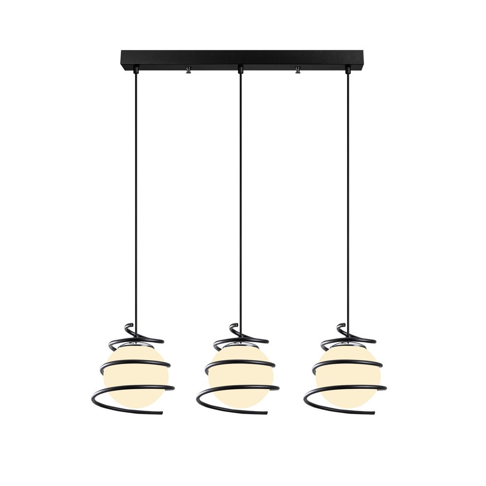 Lámpara de techo colgante decorativa con tres luces y tulipas de cristal blanco mate, con florón rectangular. Esta lámpara permite regular la altura de las luces de 36 a 116 cm de alto, personalizando el diseño final. Funciona con bombillas E27, no incluidas.