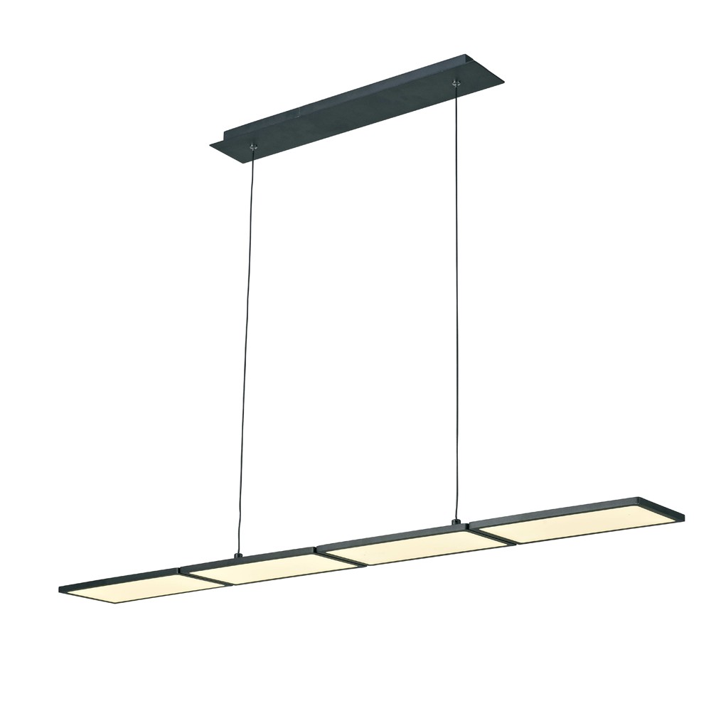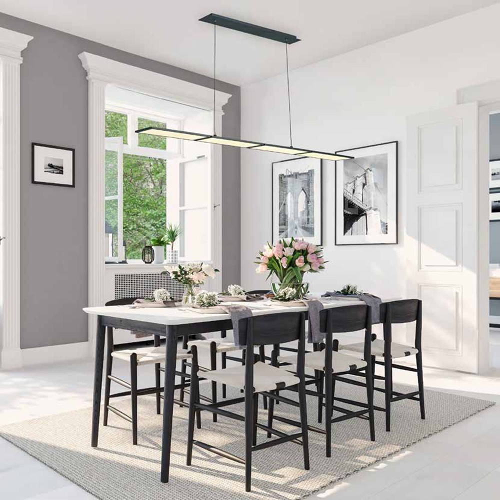 Lámpara de techo colgante con cuatro luces LED SMD integrado. Tiene una potencia de 60W, 3600lm, luz cálida de 3000K, regulable en intensidad. La estructura de la lámpara es de aluminio lacado en negro.