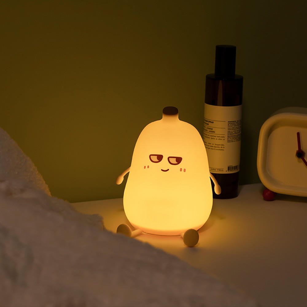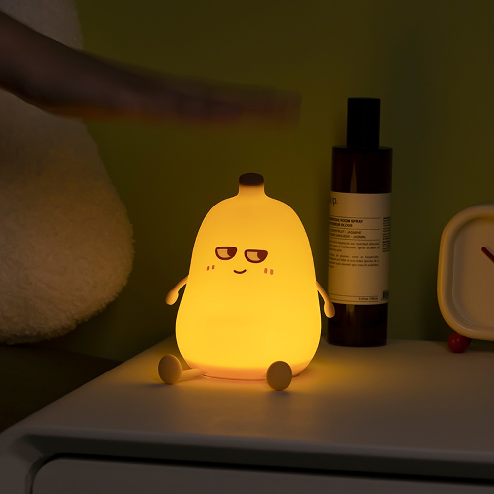 Lámpara infantil luz de noche LED Merlin. Lámpara con forma de simpático plátano amarillo diseñado para que tu hijo/hija no tenga miedo por la noche y duerma tranquilo/a. Mantener pulsado el interruptor situado debajo de la lámpara para encender y apagar la luz. Una vez encendida, pulsar brevemente para regular la intensidad de luz. Puedes activar un temporizador para que la luz se apague a la media hora o a la hora. La lámpara cuenta con batería recargable para transportar fácilmente y utilizar en cualquier lugar de casa.