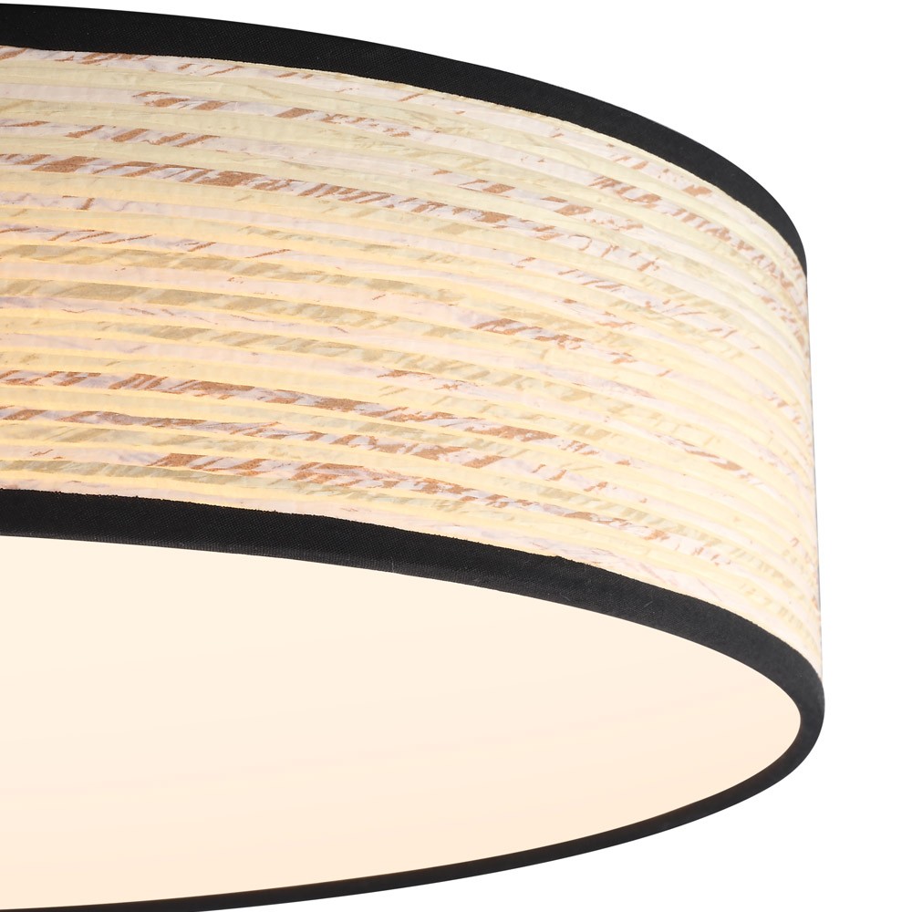 Plafón de techo LED con tres temperaturas de color*. Plafón de techo boho chic para la iluminación de salones y dormitorios. Diseño circular de 60 centímetros de diámetro con pantalla de fibras naturales efecto corteza clara. Su iluminación LED integrada se proyecta de manera difusa aportando una luz óptima en la estancia.