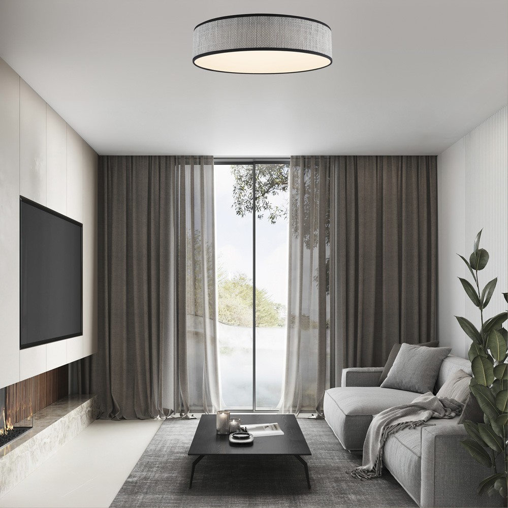 Plafón de techo LED con tres temperaturas de color*. Plafón de techo boho chic para la iluminación de salones y dormitorios. Diseño circular de 78 centímetros de diámetro con pantalla de fibras de color gris entrelazadas. Su iluminación LED integrada se proyecta de manera difusa aportando una luz óptima en la estancia.