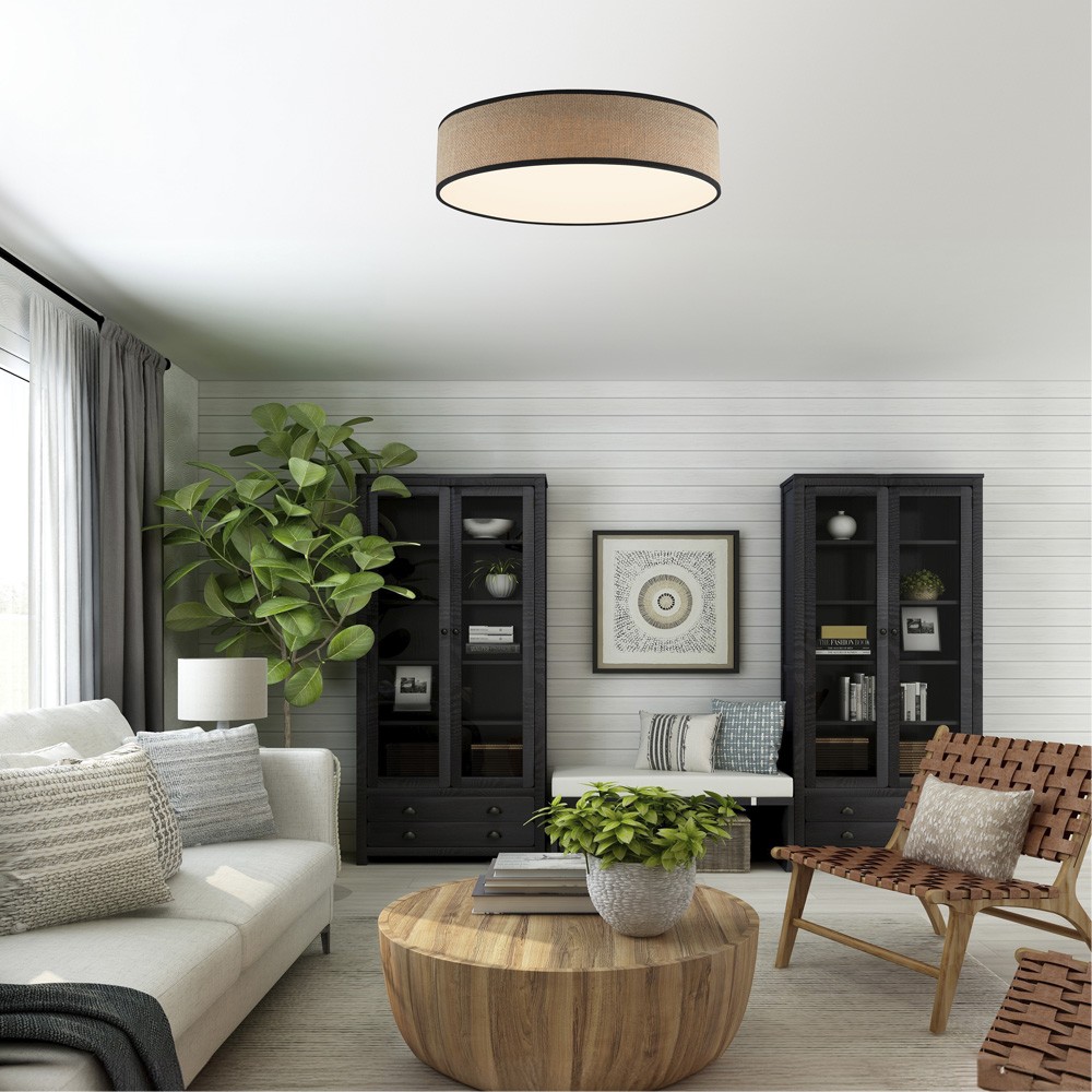 Plafón de techo LED con tres temperaturas de color*. Plafón de techo boho chic para la iluminación de salones y dormitorios. Diseño circular de 60 centímetros de diámetro con pantalla de color marrón y difusor de pmma. Su iluminación LED integrada se proyecta de manera difusa aportando una luz óptima en la estancia.
