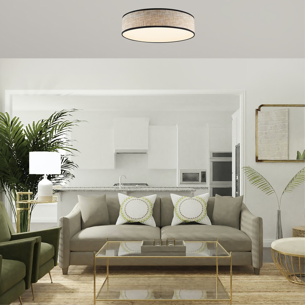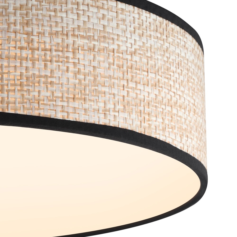 Plafón de techo LED con tres temperaturas de color*. Plafón de techo boho chic para la iluminación de salones y dormitorios. Diseño circular de 60 centímetros de diámetro con pantalla de color marrón claro y difusor de pmma. Su iluminación LED integrada se proyecta de manera difusa aportando una luz óptima en la estancia.