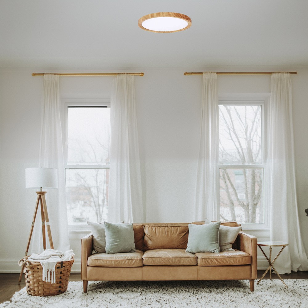 Plafón de superficie con tres temperatura de color. Plafón de techo LED circular ultra slim perfecto para la iluminación funcional de espacios de interior. Cuenta con tres temperaturas de color (3000-4000-6500K)* y con tres intensidades de luz (10-50-100%)**. Fácil instalación directamente en el techo y diseño ultra fino (25mm). Marco de aluminio de color madera y difusor de acrílico.