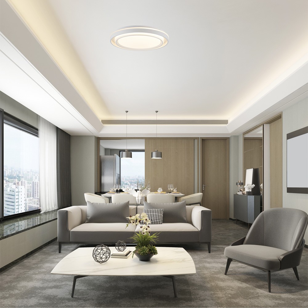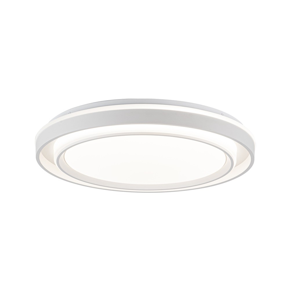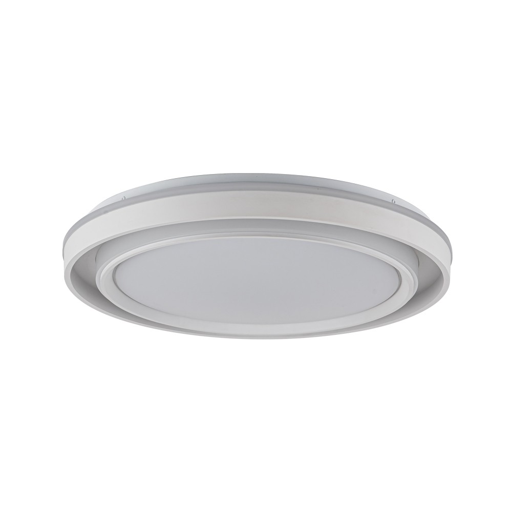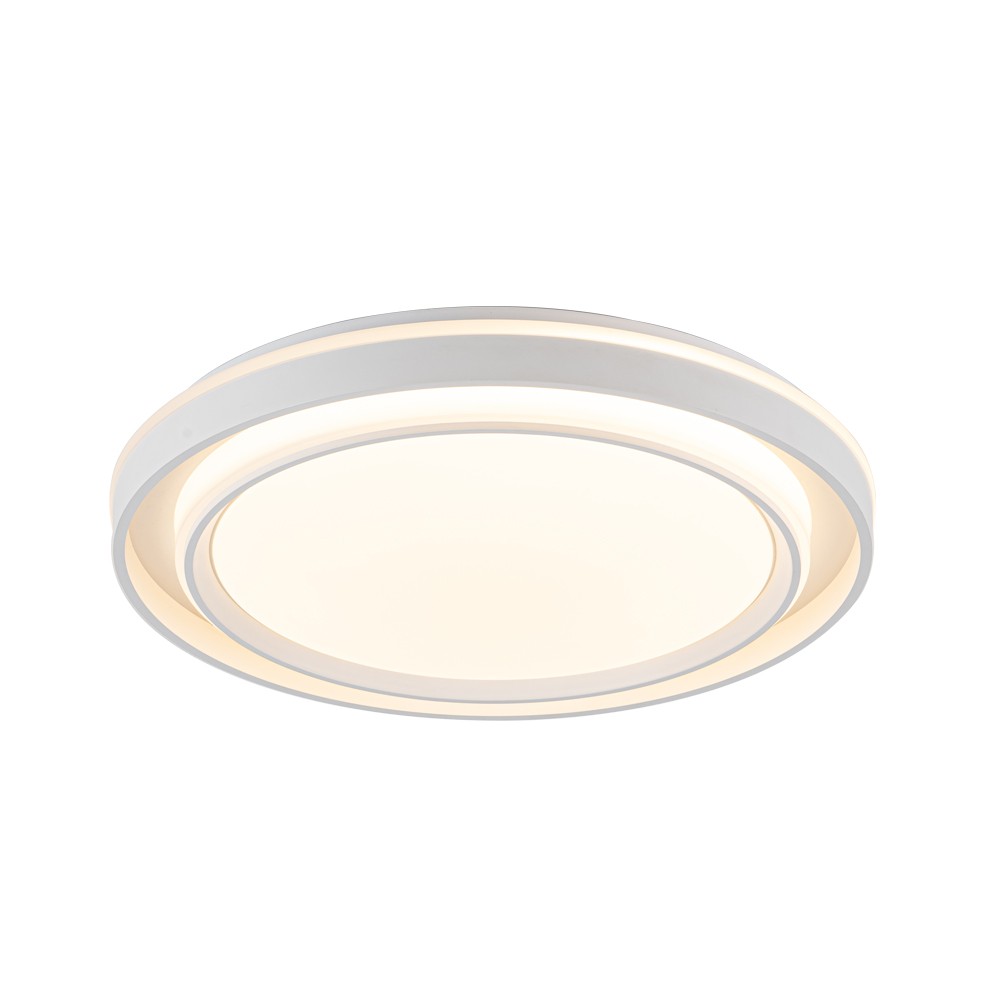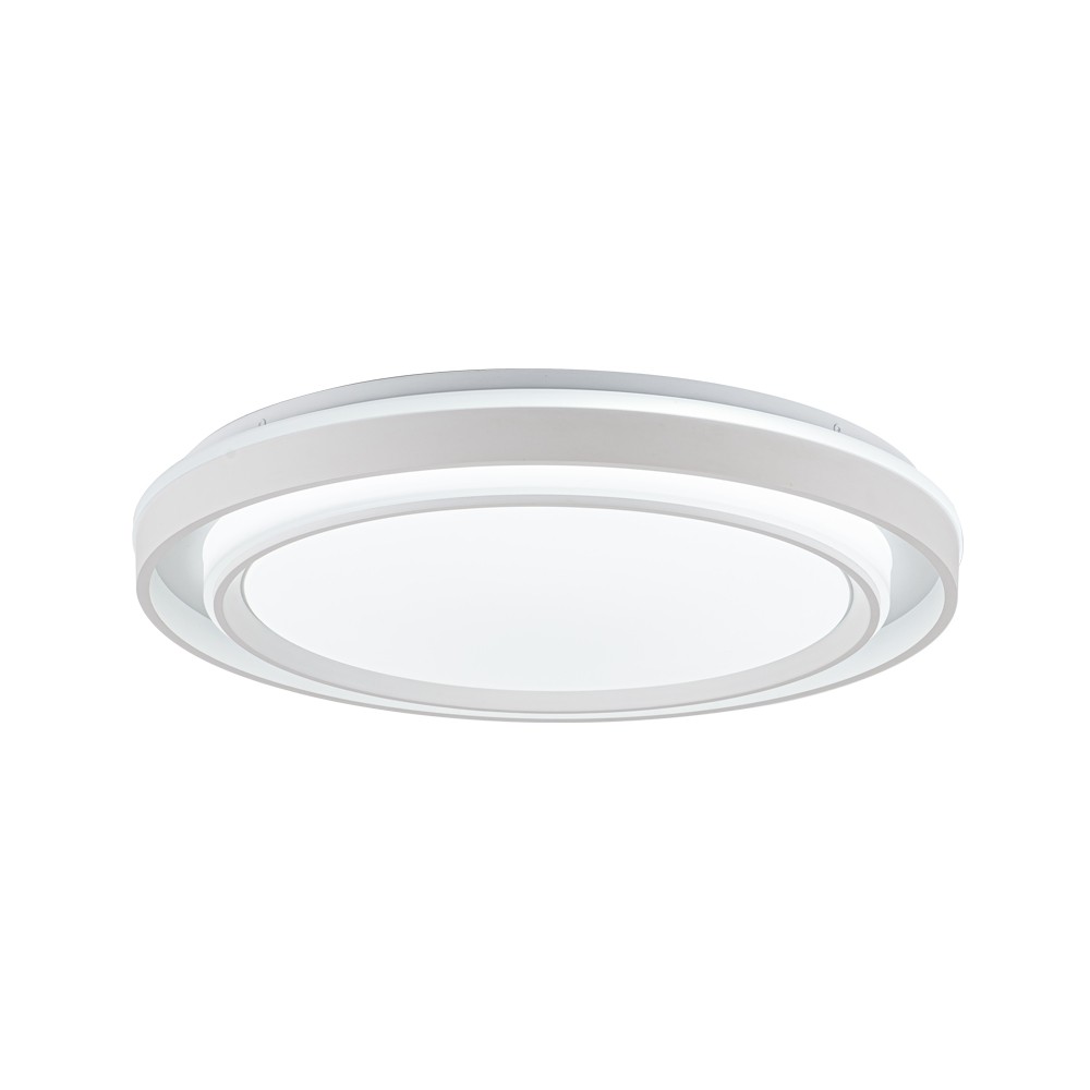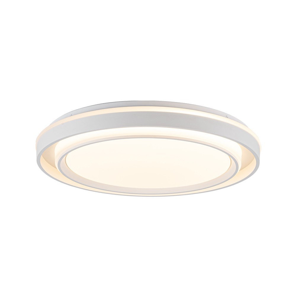 Plafón de techo LED 3CCT dimmable Nasot. Plafón de techo de 50 centímetros de diámetro diseñado para la iluminación principal de un dormitorio o de un salón. Lleva integrada iluminación LED con tres intensidades (20-50-100%) y tres tonos de color (3000-4000-6000K), además de poder regular ambas gradualmente. Tiene una configuración de luz modo noche, memoria de encendido y temporizador (1-2H) para programar el apagado. Mando a distancia incluido. LED 72W, 7290 lm. y 3CCT.