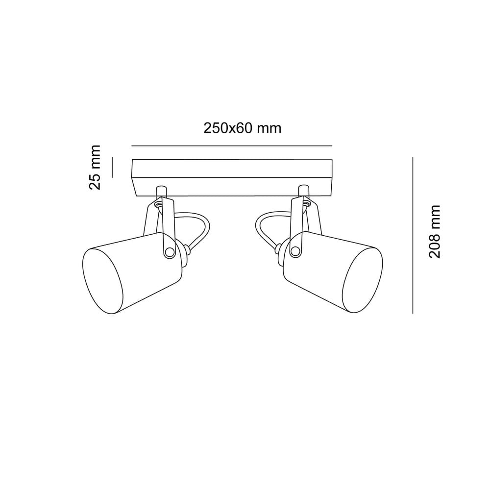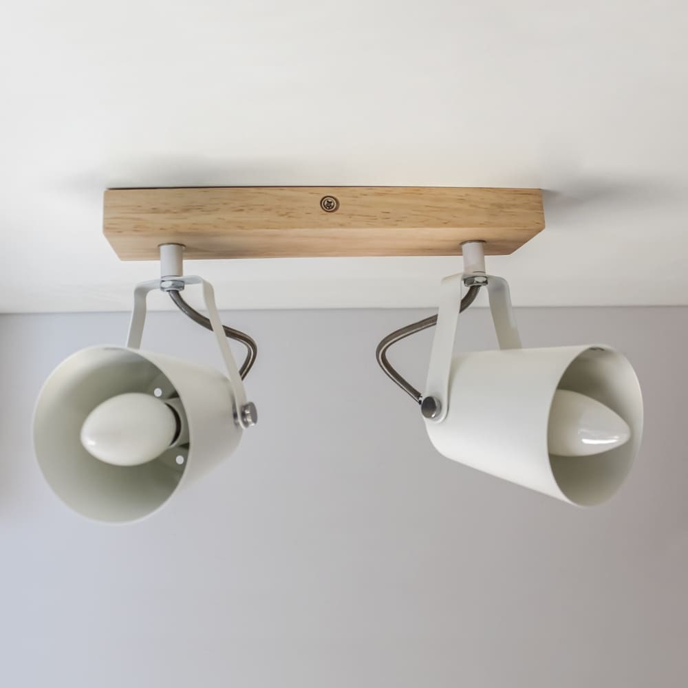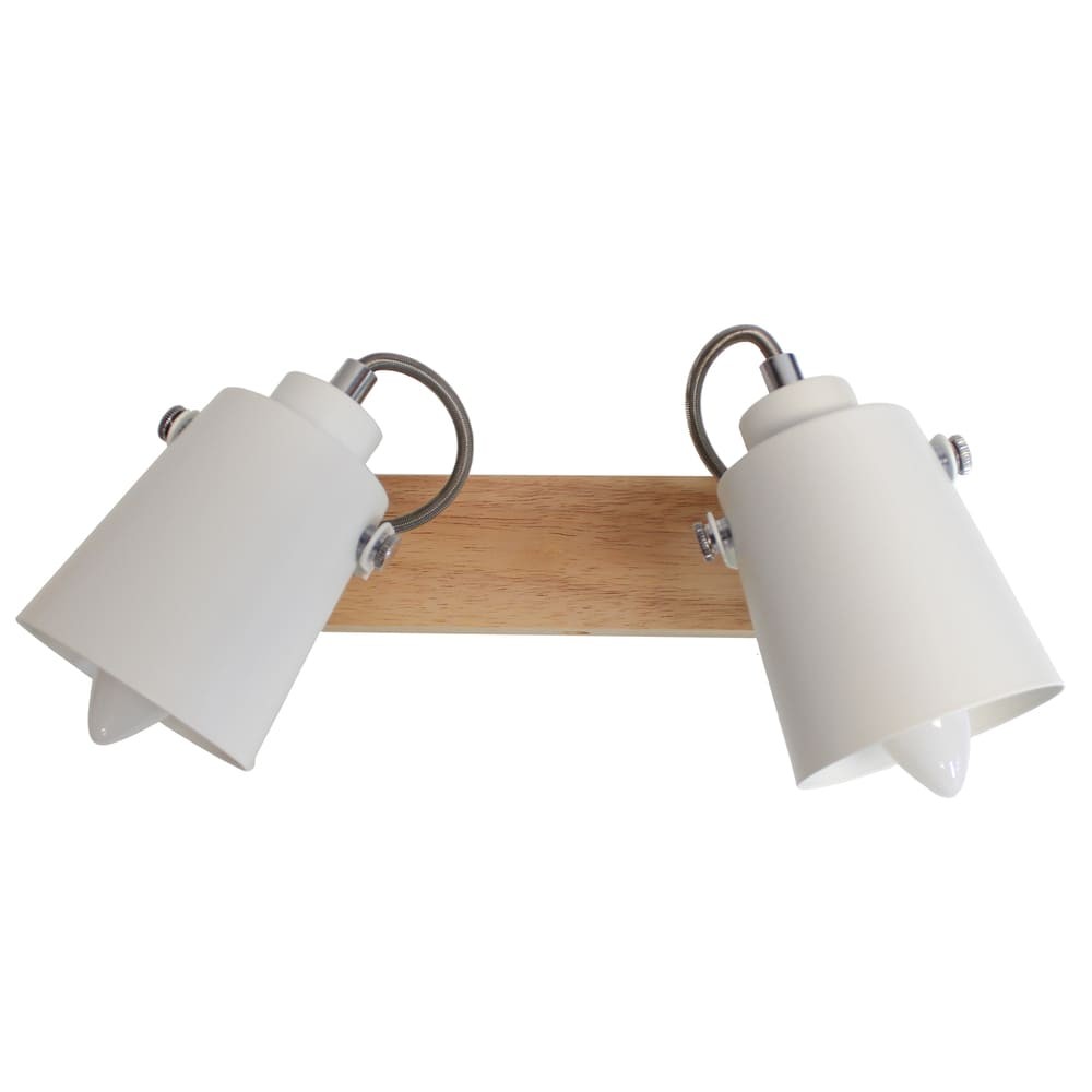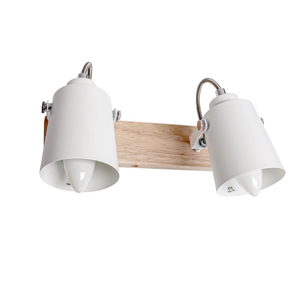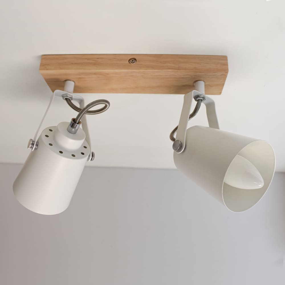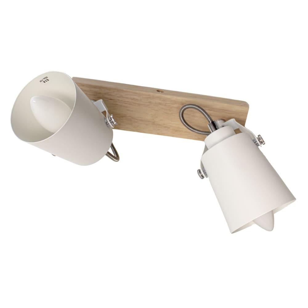 Plafón de techo decorativo con dos focos de aluminio para bombillas E14, no inlcuidas. Los focos, lacados en blanco, pueden moverse para dirigir la luz al punto deseado. La base de 67×6 cm es de madera natural.