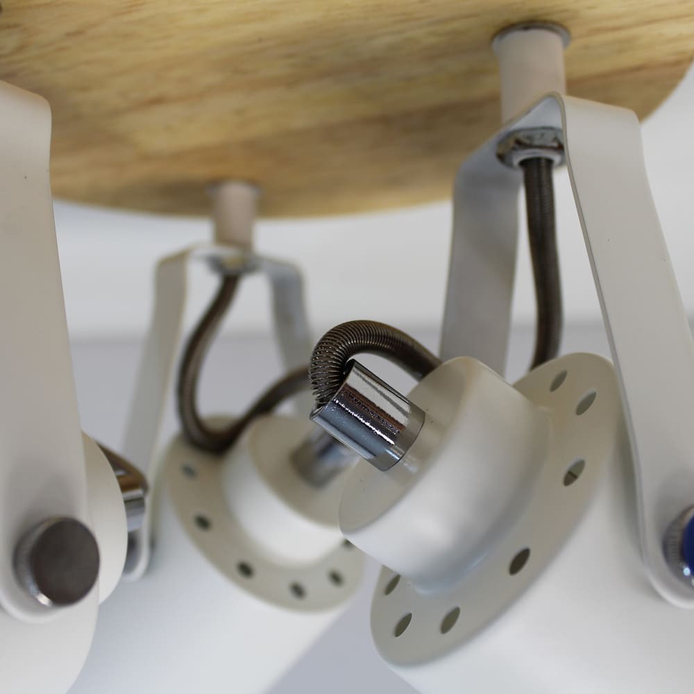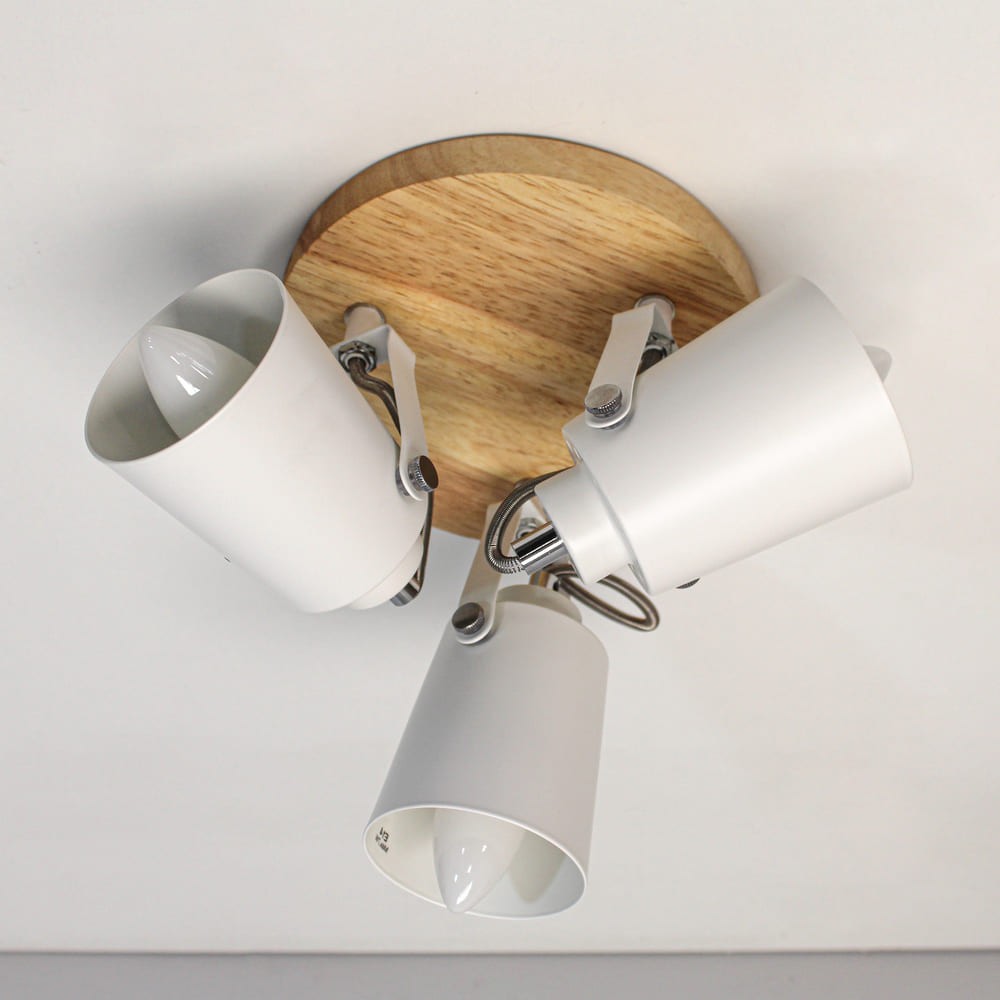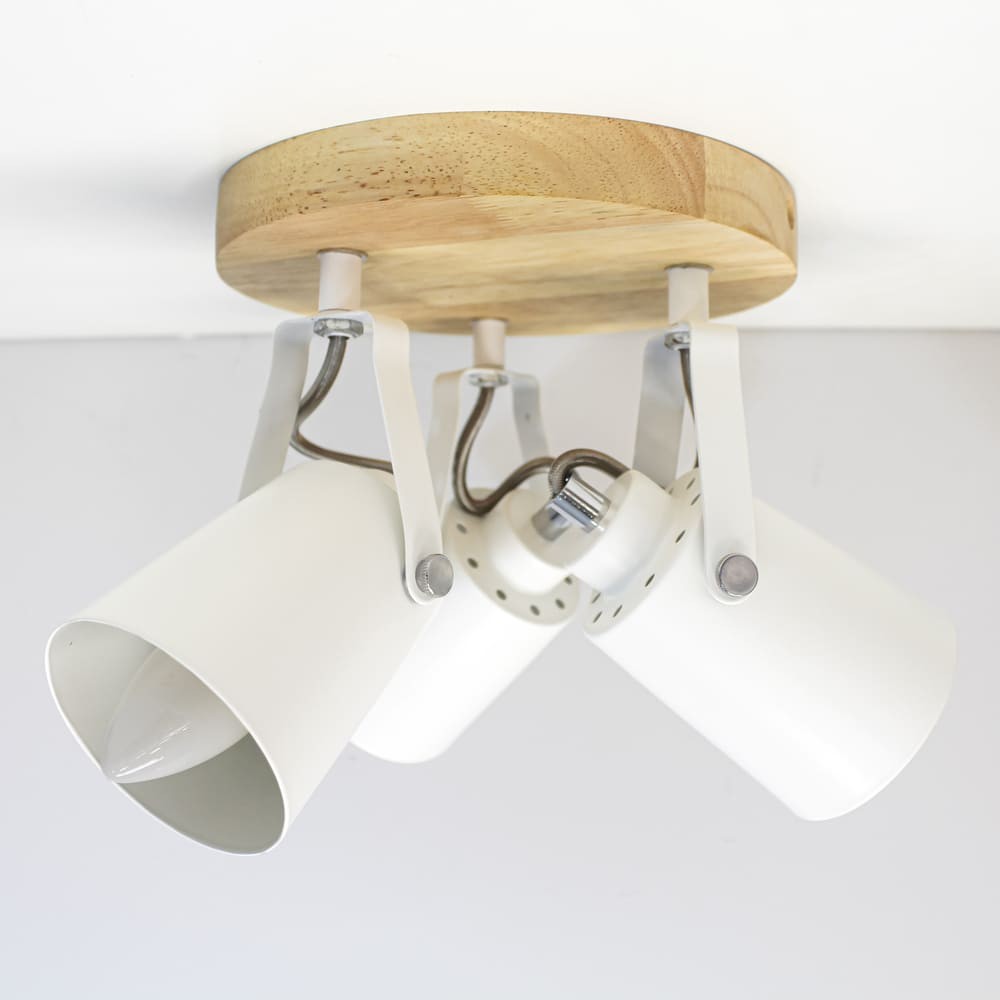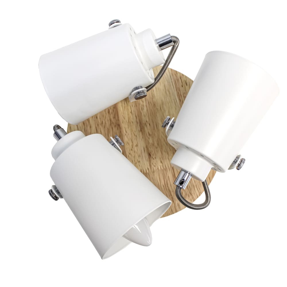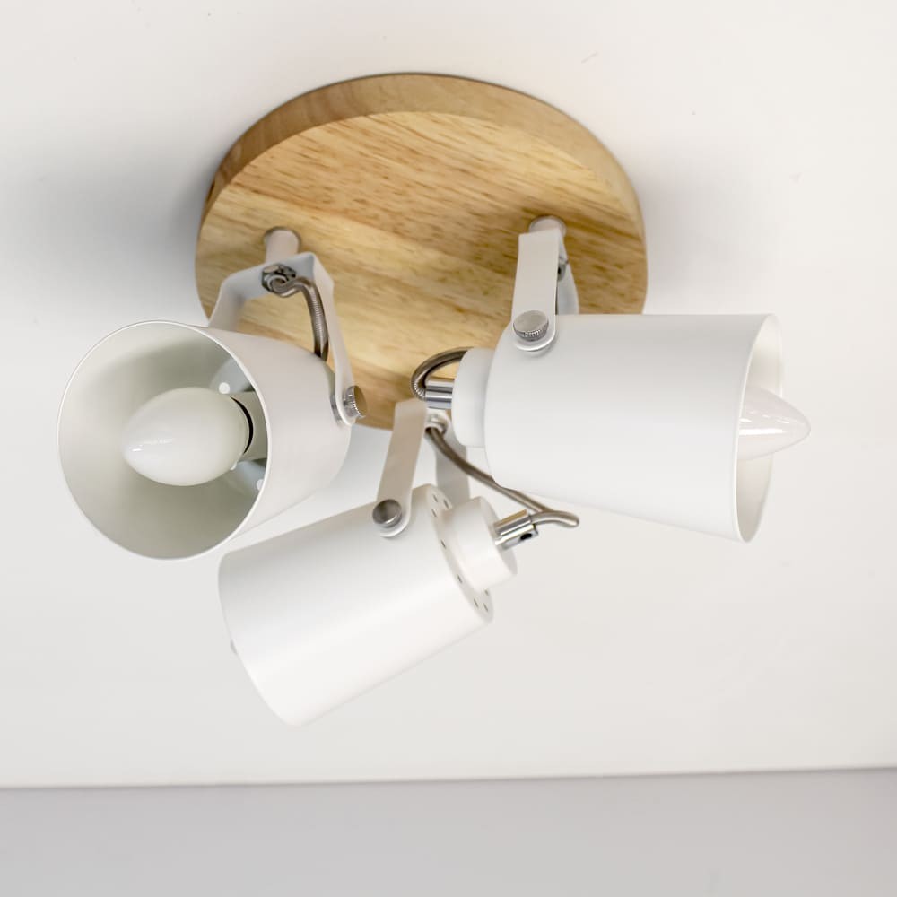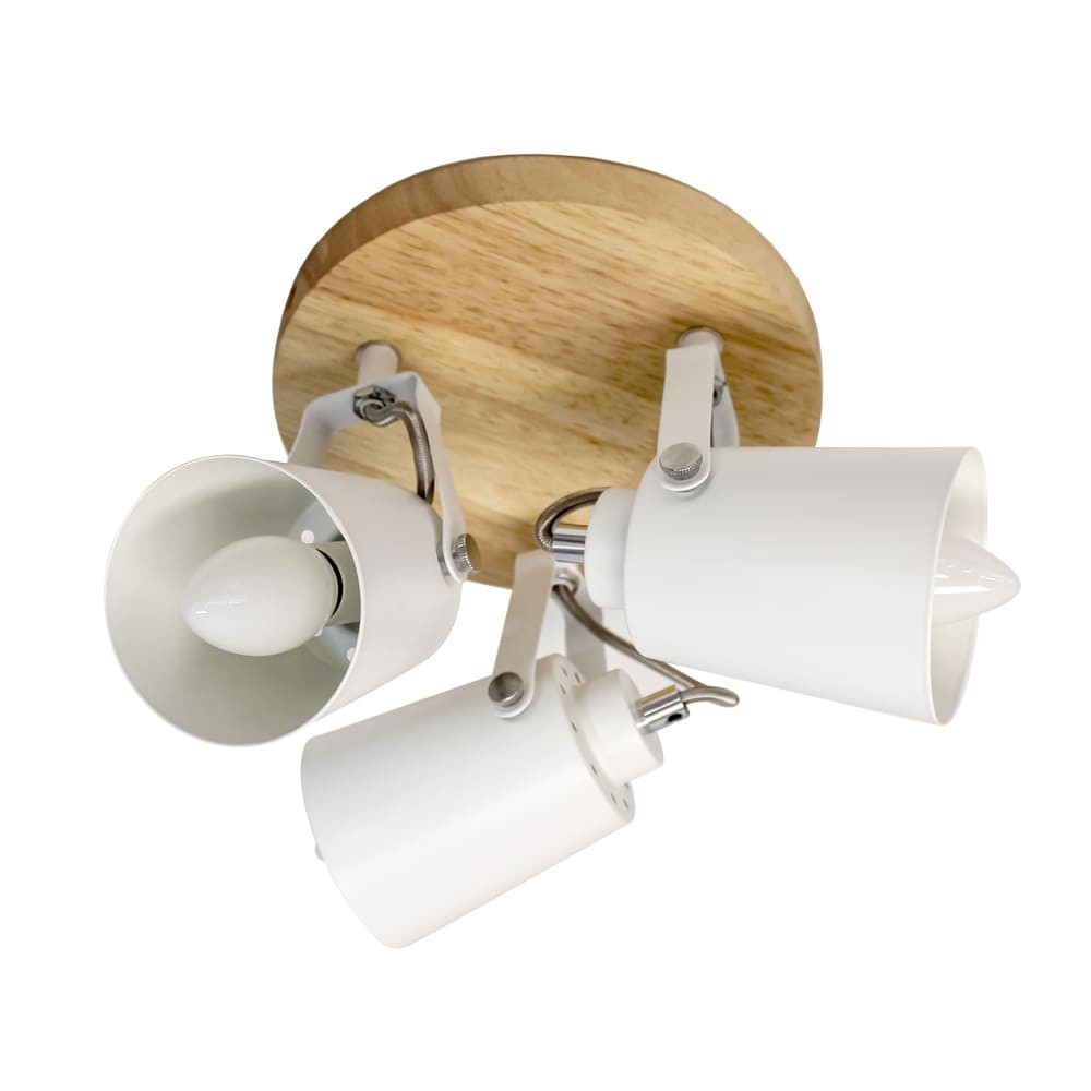 Plafón de techo decorativo con tres focos de aluminio para bombillas E14, no inlcuidas. Los focos, lacados en blanco, pueden moverse para dirigir la luz al punto deseado. La base circular de 20 cm es de madera natural.