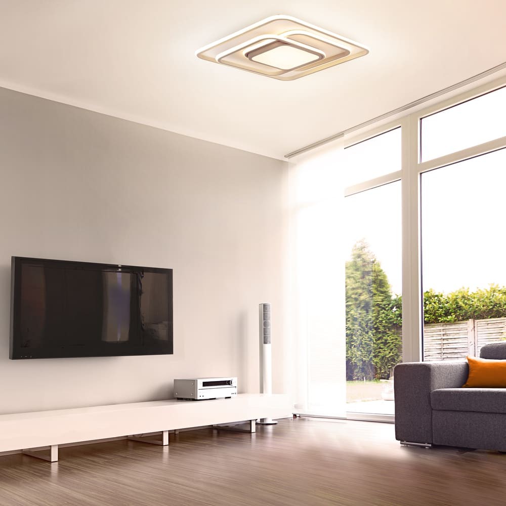 Plafón LED decorativo cuadrado con iluminación led integrada de tres temperaturas. La estructura del plafón permite crear, con sus tiras de iluminación, diferentes ambientes de iluminación. Con el mando incluido, además de ajustar el tono de luz puede regularse la intensidad y encenderse y apagarse. Además, dispone de modo noche de iluminación y función memoria para recuperar la última iluminación configurada.
