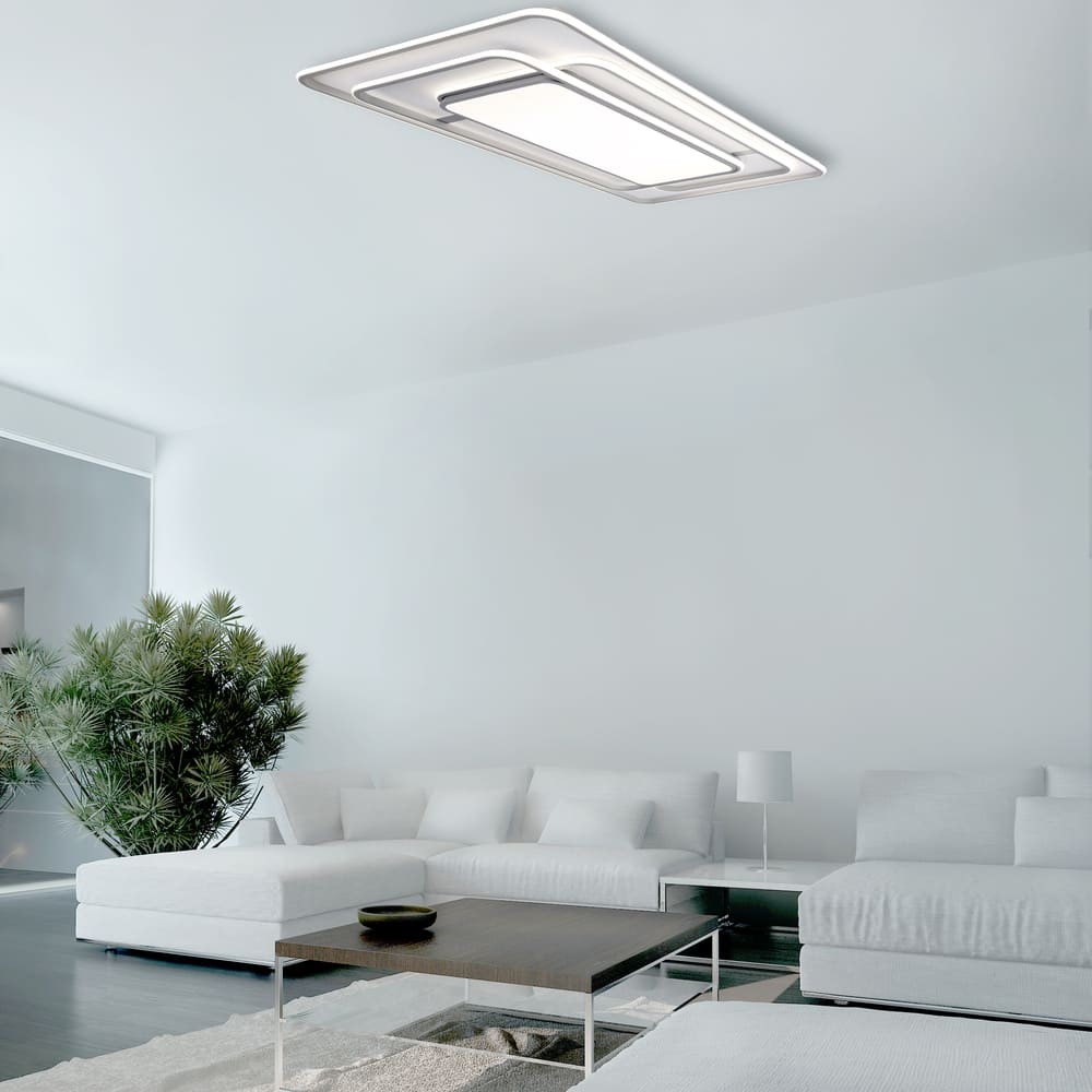 Plafón LED decorativo con iluminación led integrada de tres temperaturas. La estructura del plafón permite crear diferentes ambientes de iluminación. Con el mando incluido, además de ajustar el tono de luz puede regularse la intensidad y encenderse y apagarse. Además, dispone de modo noche de iluminación y función memoria para recuperar la última iluminación configurada.