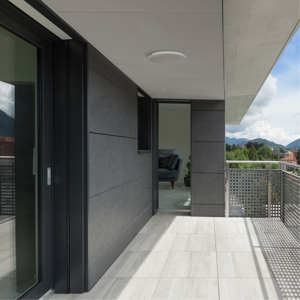 Plafón de techo para iluminación exterior. Plafón de techo de policarbonato con IP54 diseñado para la iluminación funcional de balcones, terrazas y porches. Diseño circular con iluminación LED de 24W, 2400 lúmenes y temperatura de color 4000K (luz blanca neutra). Fácil instalación directamente en el techo.
