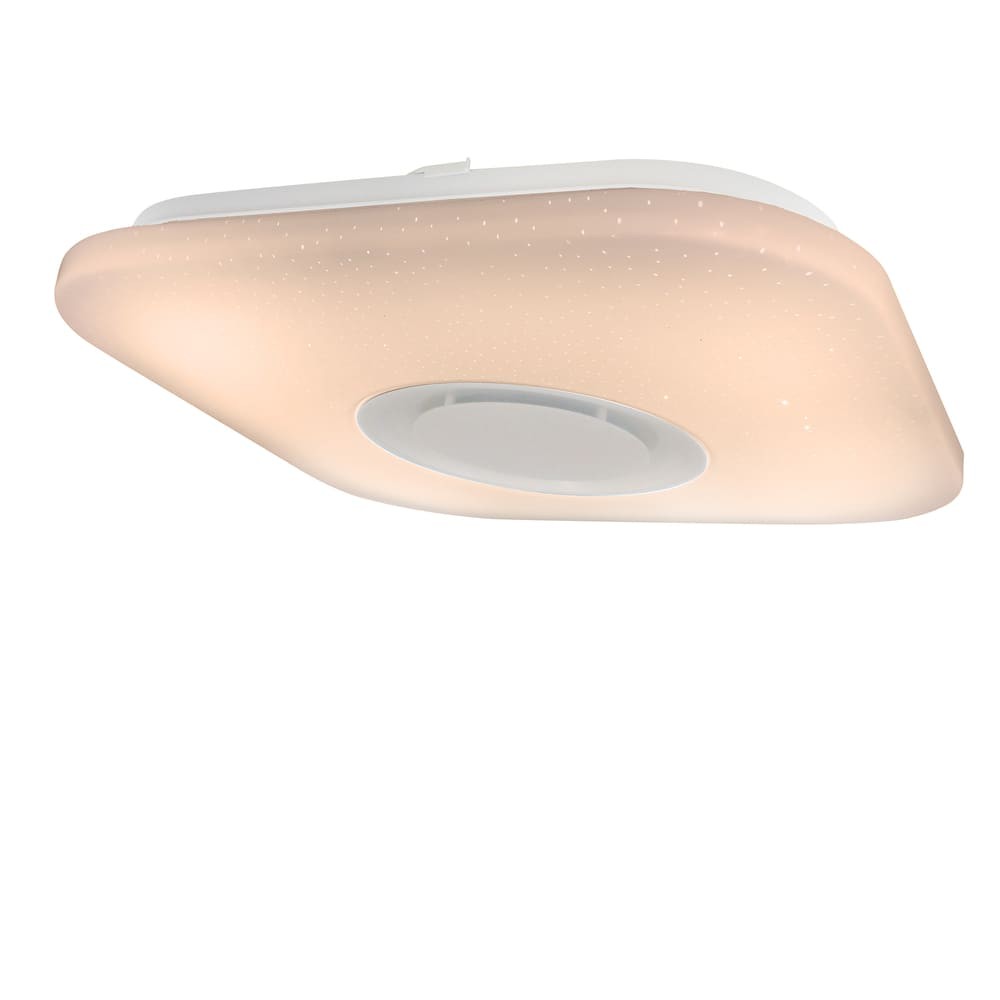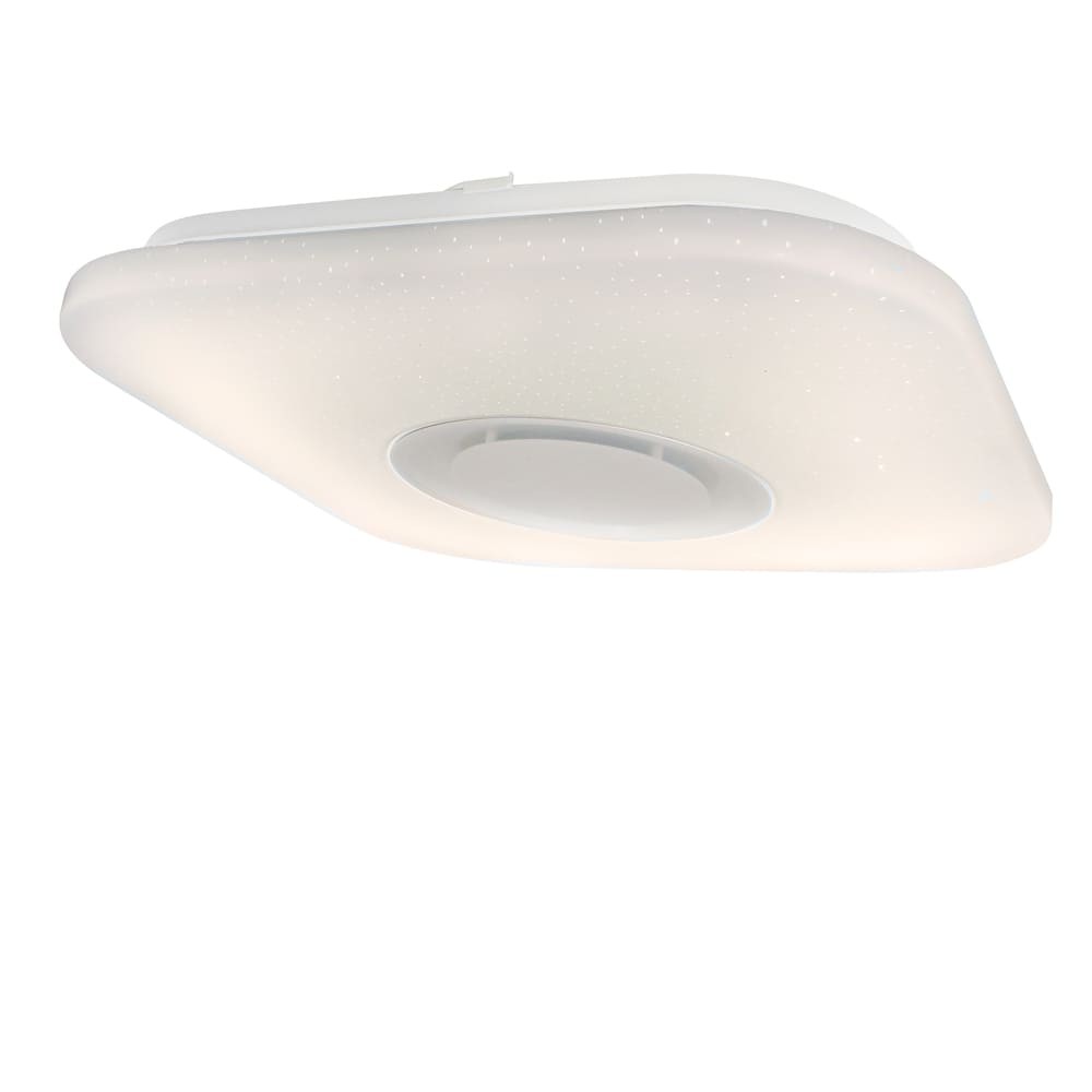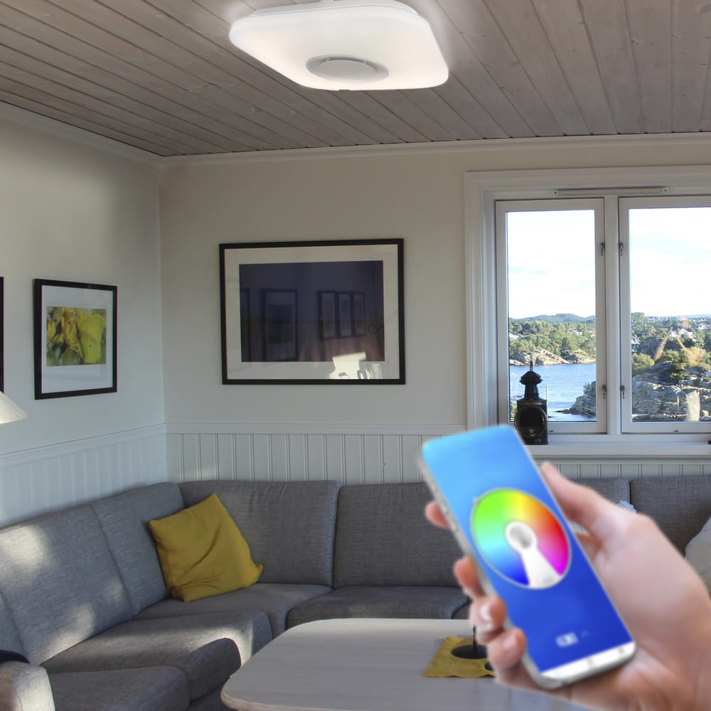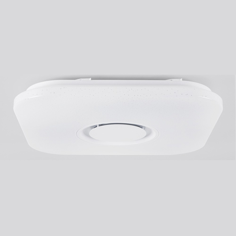 Plafón de techo cuadrado con luz LED RGB y altavoz. Plafón de techo muy práctico para iluminar dormitorios y salones. Intensidad de lúmenes y temperatura de color regulables (3000-6500K) con una amplia gama de colores RGB. Se controla con un mando a distancia con capacidad para hacerlo también desde el smartphone vía APP. Cuenta con un altavoz integrado para reproducir música. Difusor de PVC blanco.