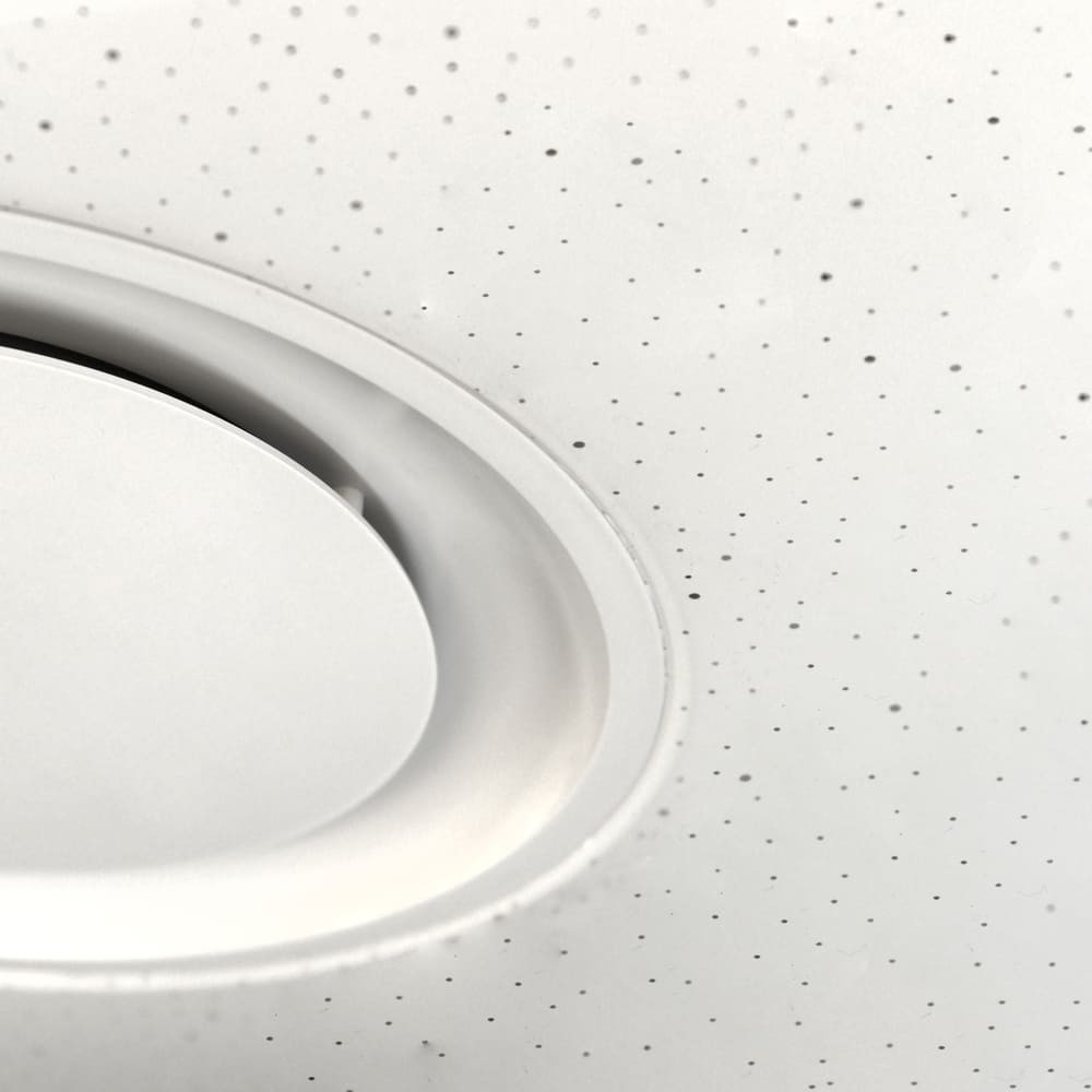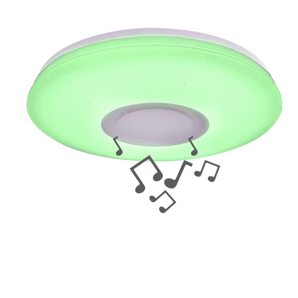 Plafón de techo moderno con iluminación LED RGB y altavoz integrado. Este plafón cuenta con iluminación regulable en intensidad y temperatura de color además de una amplia gama de colores RGB. Gracias a su altavoz integrado puedes reproducir tu música favorita por conexión Bluetooth. Perfecto para salones modernos y dormitorios juveniles. Puede controlarse también con el smartphone a través de una app. Estructura de ABS y aluminio con difusor opal blanco.