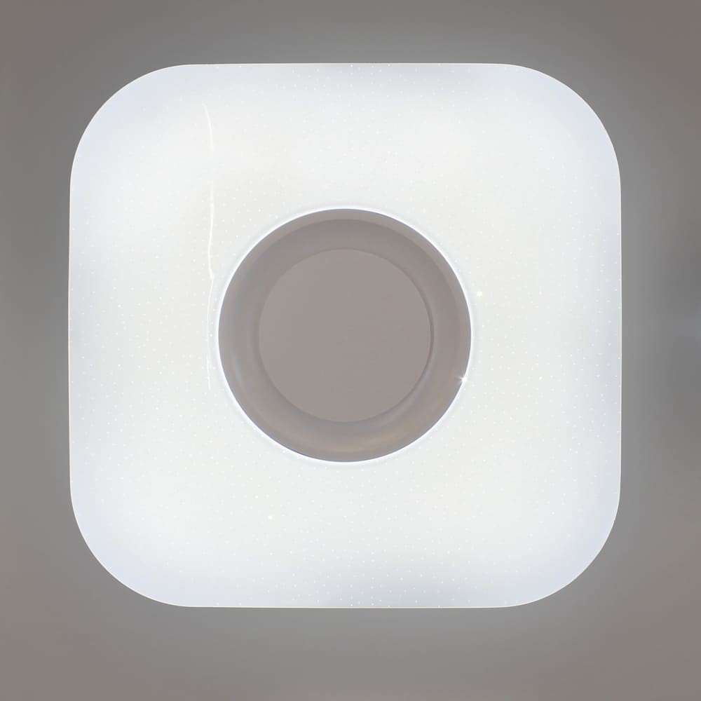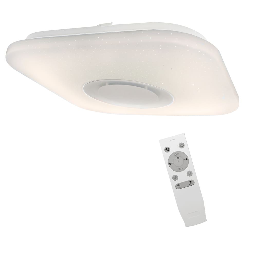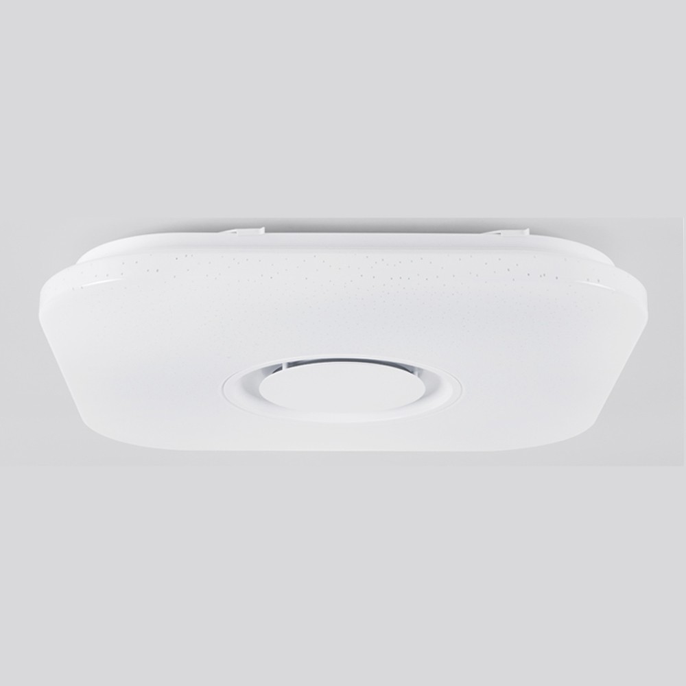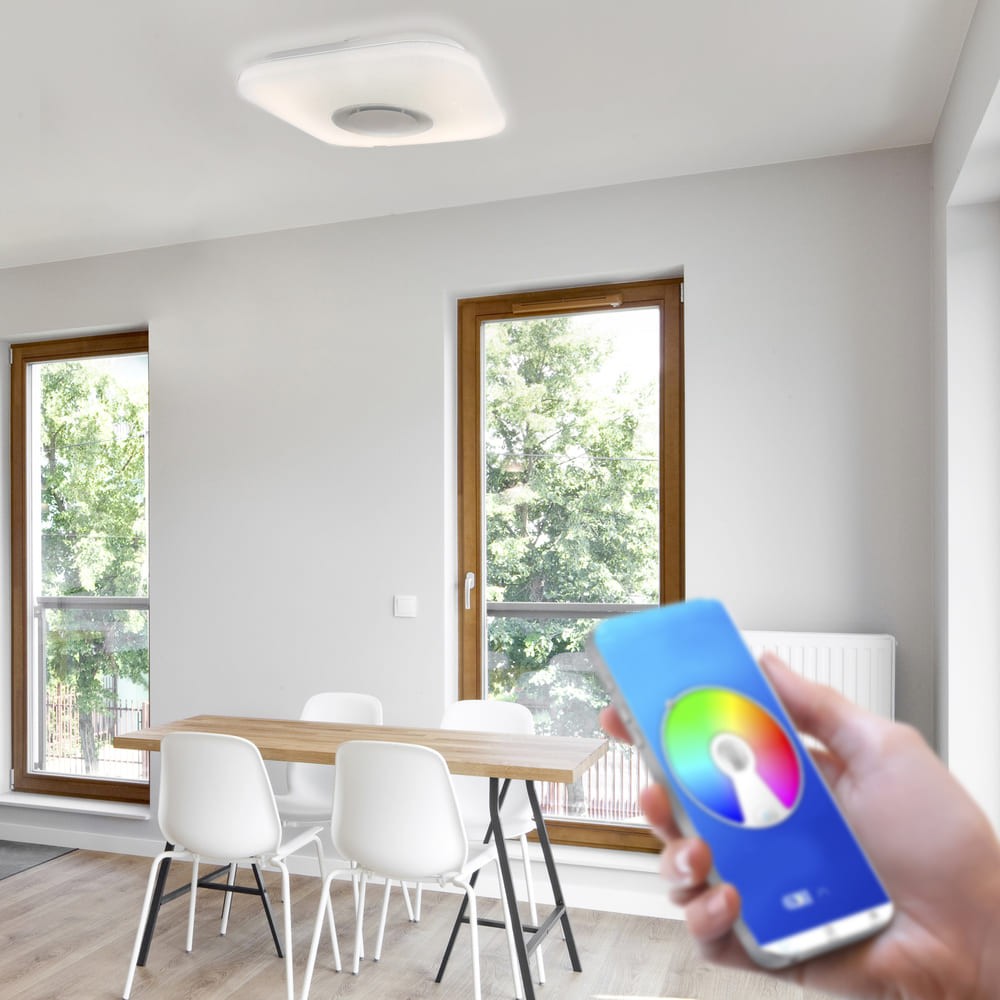 Plafón de techo cuadrado con luz LED RGB y altavoz. Plafón de techo muy práctico para iluminar dormitorios y salones. Intensidad de lúmenes y temperatura de color regulables (3000-6500K) con una amplia gama de colores RGB. Se controla con un mando a distancia con capacidad para hacerlo también desde el smartphone vía APP. Cuenta con un altavoz integrado para reproducir música. Difusor de PVC blanco.