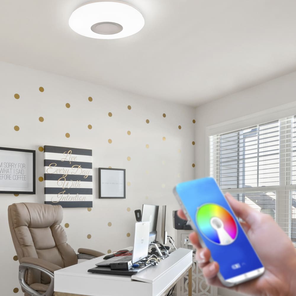Plafón de techo con LED RGB y altavoz integrado. Este plafón cuenta con iluminación regulable en intensidad y temperatura de color con un amplia gama de colores RGB. Gracias a su altavoz integrado puedes reproducir tu música favorita por conexión Bluetooth. Puede controlarse con el smartphone a través de una app. Perfecto para salones modernos y dormitorios juveniles. Estructura de ABS y aluminio con difusor opal blanco.