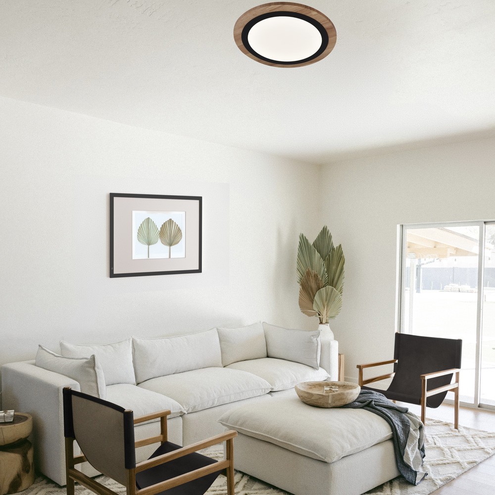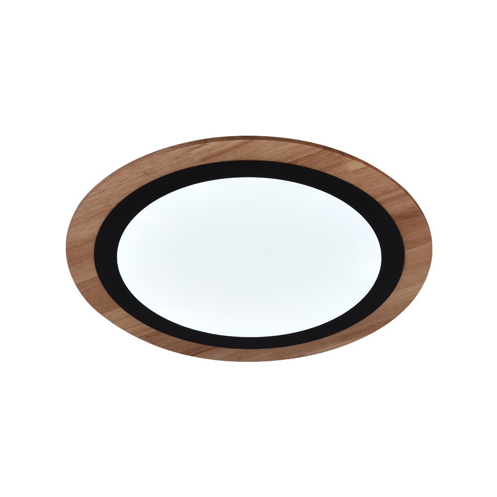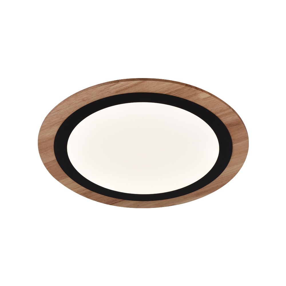 Plafón de techo LED Smart para salones y dormitorios. Plafón circular con tecnología Smart y bluetooh para controlar la iluminación desde un smartphone o tablet. Compacto diseño de forma circular en color madera y un aro interior de color negro. Lleva integrada iluminación LED de 32W y 2800 lúmenes regulable en tono e intensidad de luz. Incluye mando a distancia.