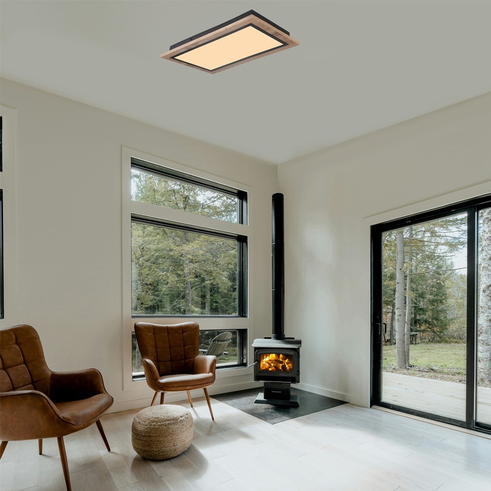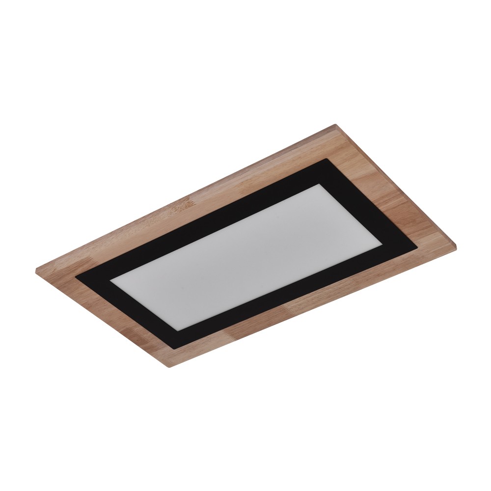 Plafón LED Smart para salones y dormitorios. Plafón rectangular con tecnología Smart y bluetooh para controlar la iluminación desde un smartphone o tablet. Diseño de forma rectangular en color madera y un marco interior de color negro como contorno del difusor. Lleva integrada iluminación LED de 35W y 3500 lúmenes regulable en tono e intensidad de luz. Incluye mando a distancia.