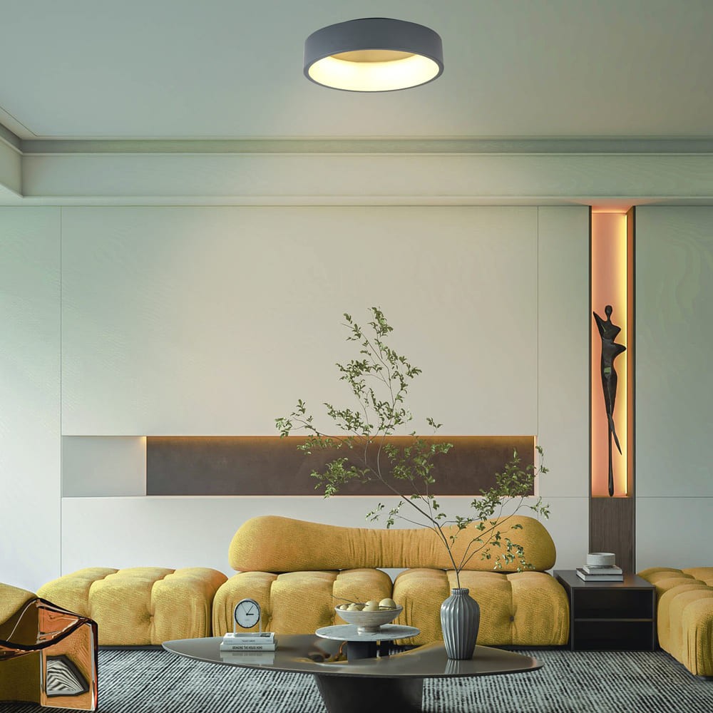 Plafón de techo LED Silen con tres temperaturas de color. Plafón circular con mando a distancia para regular la intensidad de lúmenes y el tono de color de la iluminación. Fabricado en aluminio de color gris antracita y difusor de policarbonato. Cuenta con memoria de encendido de modo que al apagarlo y encenderlo se mantiene la última configuración de luz.