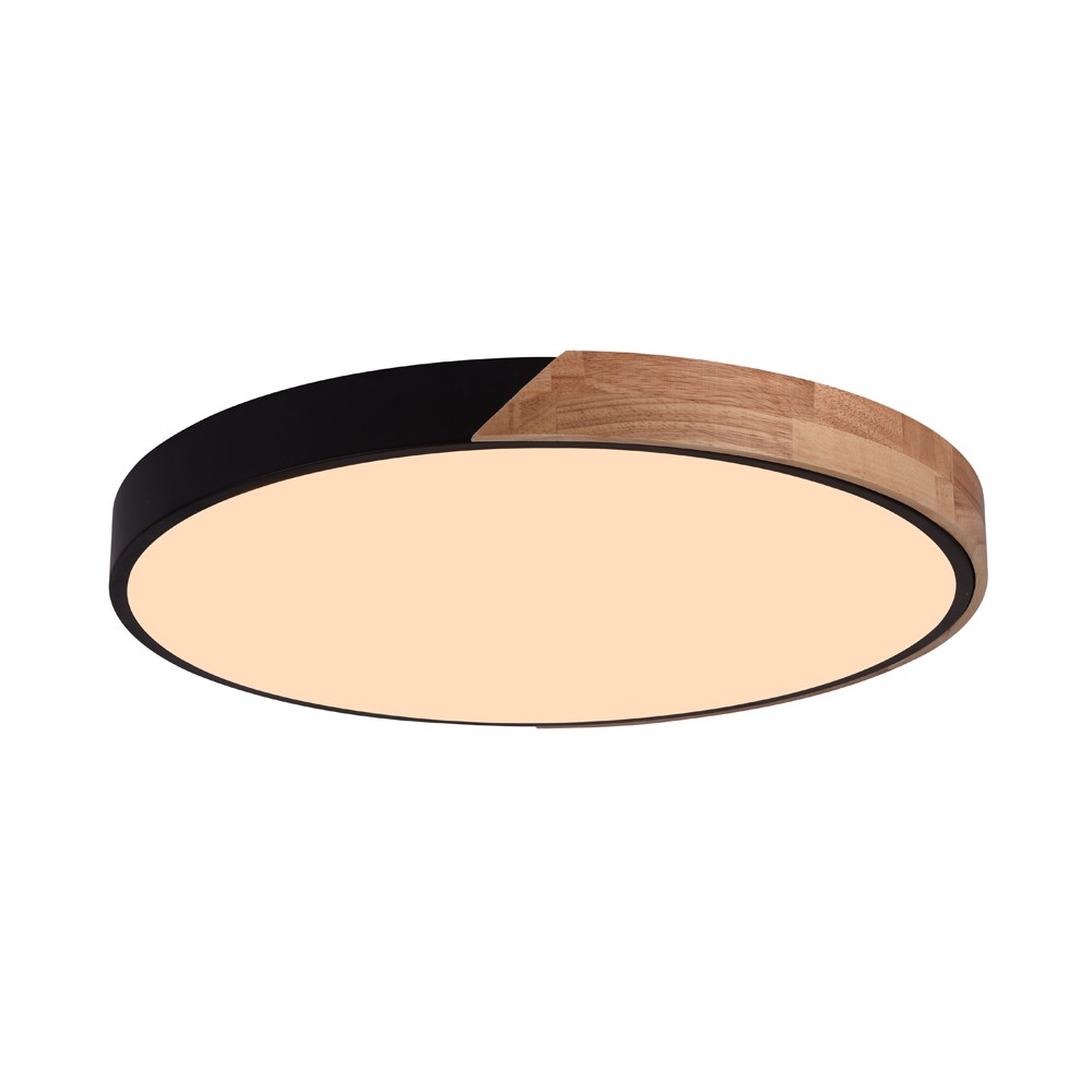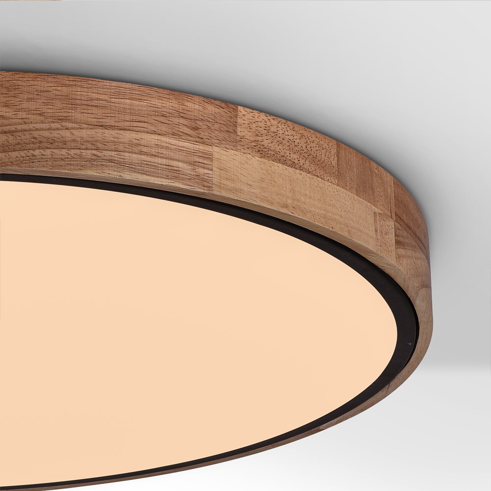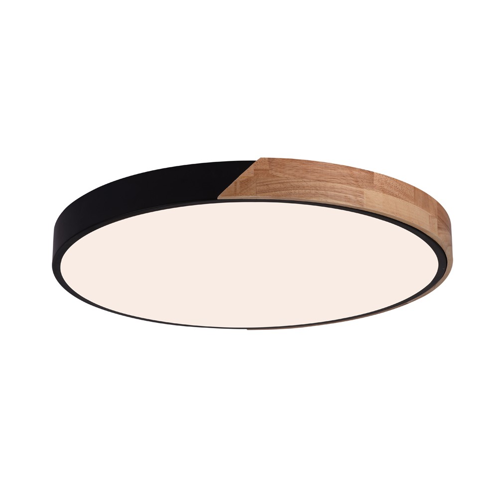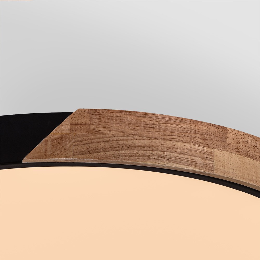 Plafón de techo LED Taoro con tecnología SMART. Plafón de techo circular de color negro con una pieza decorativa de madera. Puedes regular tanto la intensidad de lúmenes como seleccionar la temperatura de color de la iluminación (3000-4000-6000K). Memoria de encendido y modo configurado luz de noche. El plafón incluye mando a distancia y puede controlarse también con el smartphone por conexión bluetooth (tecnología smart).
